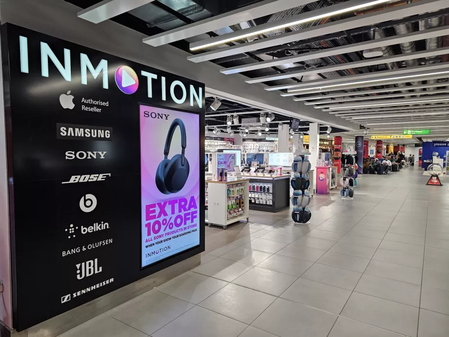 Após o controlo de segurança, faça compras na grande loja duty free. Há também lojas de recordações e de eletrónica (InMotion).