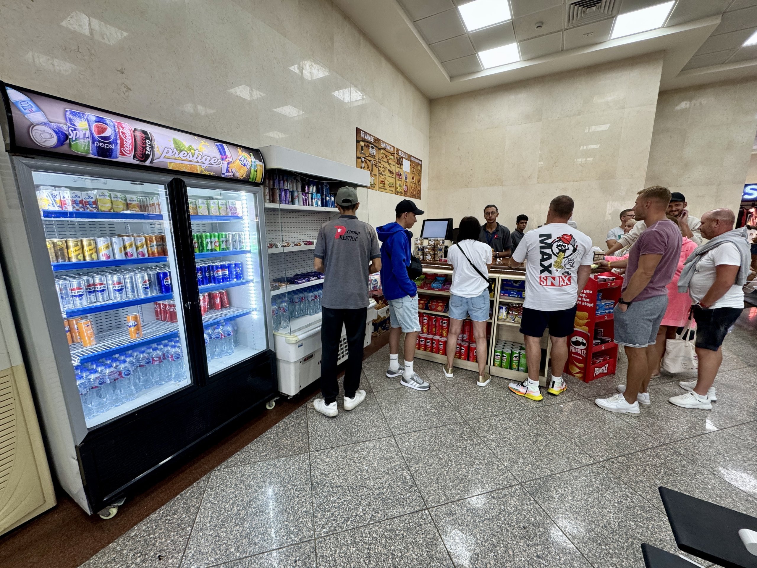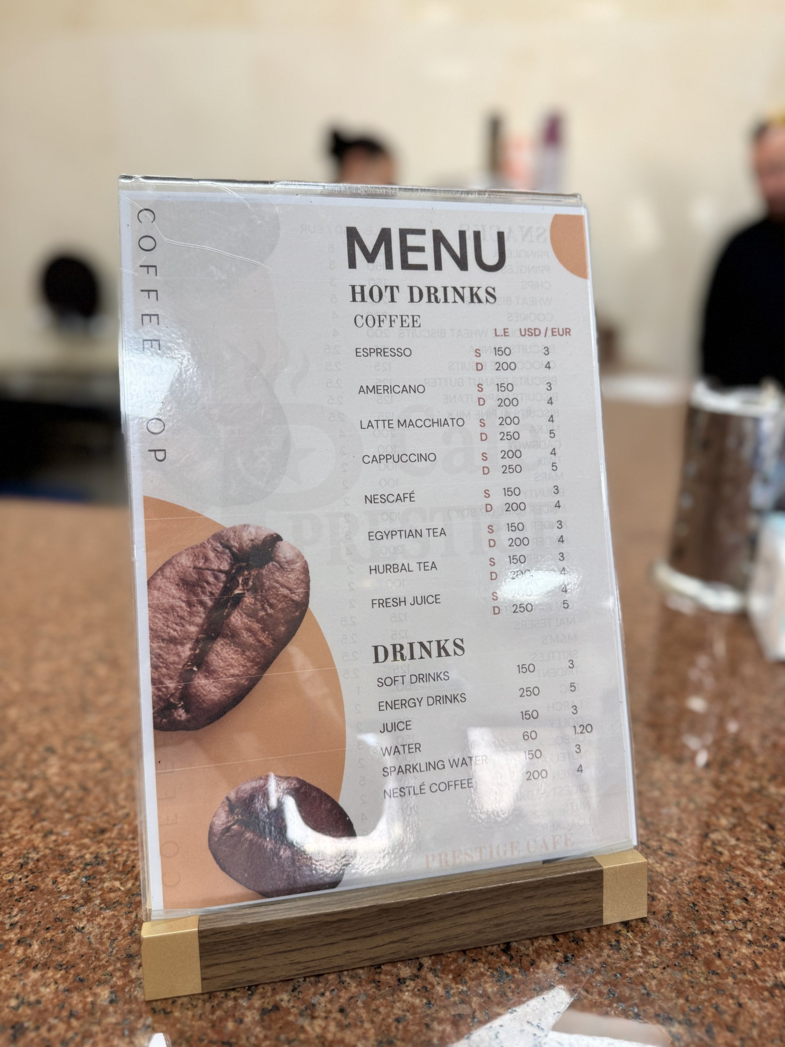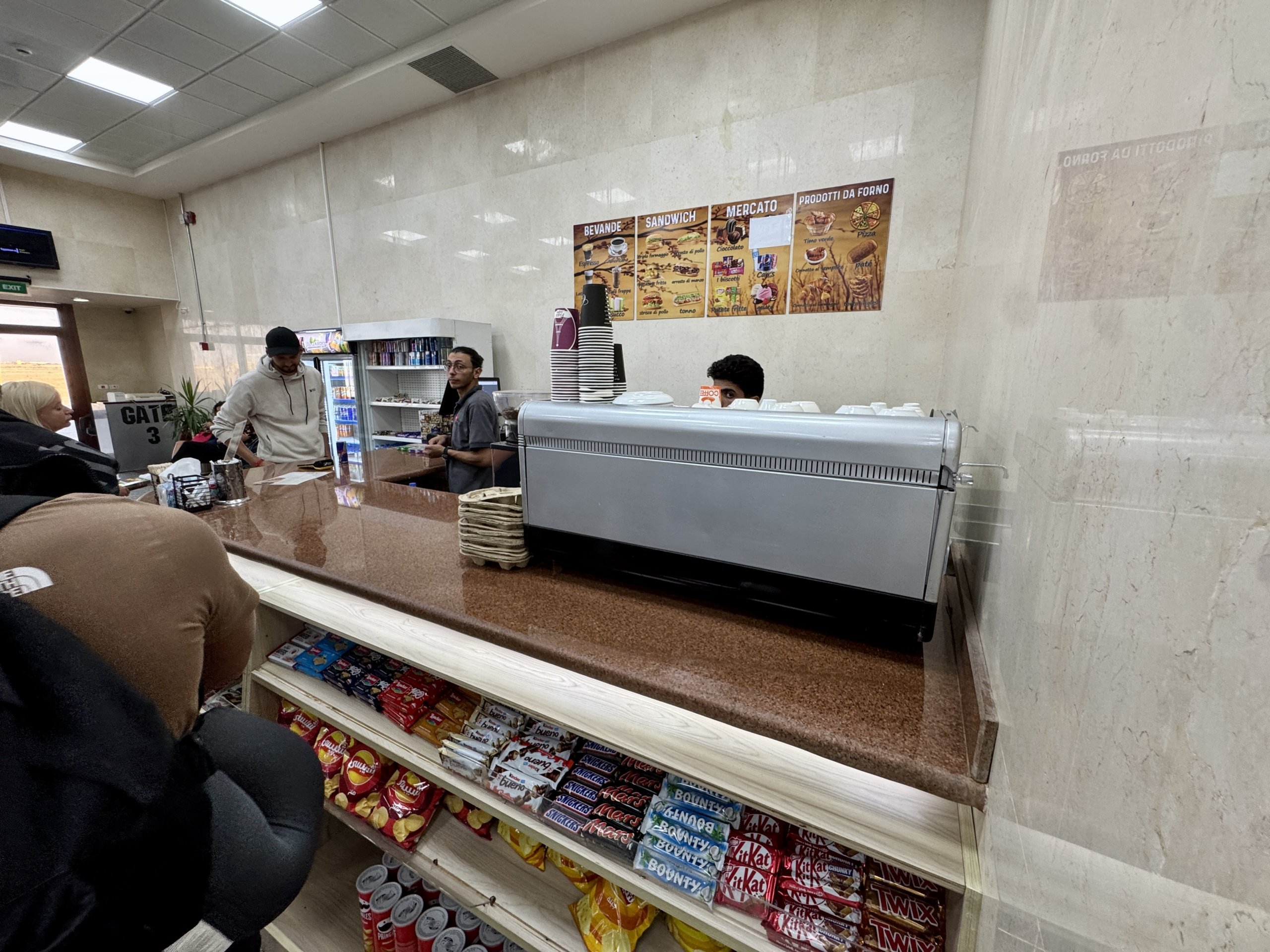 Utilize o pequeno café com uma gama limitada de produtos para comprar café, chá egípcio, bebidas doces e sumos e snacks ligeiros sob a forma de barras doces e batatas fritas salgadas.