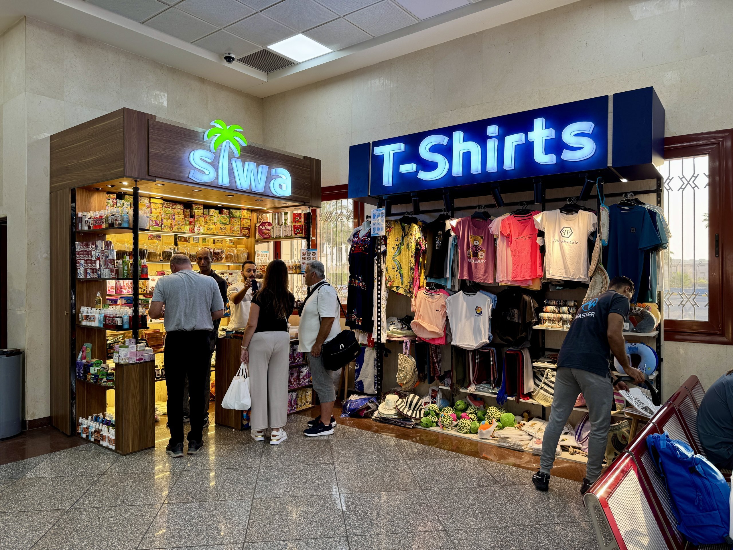 Na zona de espera antes da partida, encontrará um total de 3 pequenas lojas que oferecem várias bugigangas, recordações, t-shirts e perfumes de fabrico egípcio. Não espere qualidade e muito menos originalidade.