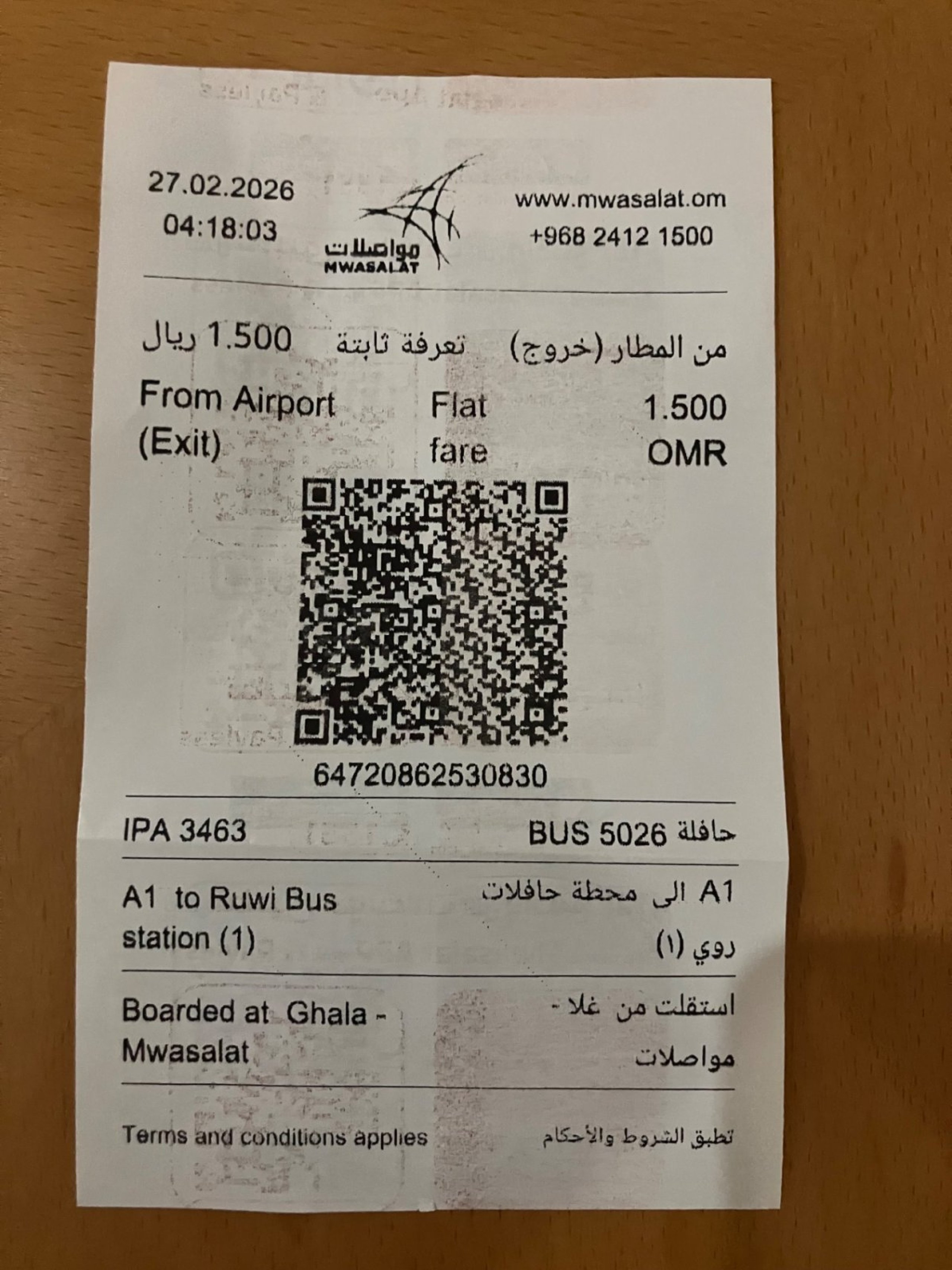 O bilhete de autocarro A1 do aeroporto custa 1,5 OMR, a experiência de hoje