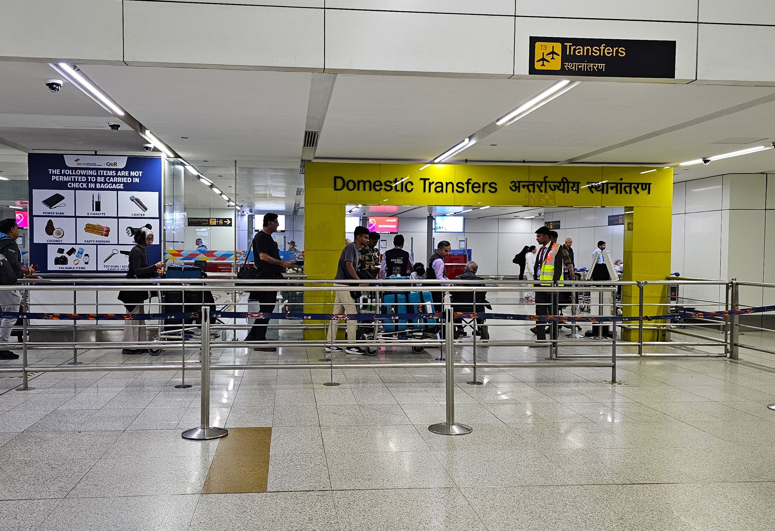 Se viajar com uma reserva a partir de um destino internacional e seguir de Deli para outro destino indiano, deve sempre passar pela imigração, recolher a sua bagagem, dirigir-se à zona pública da sala de chegadas, fazer o check-in da bagagem e passar pelo controlo de segurança no balcão especial "Domestic Transfer".