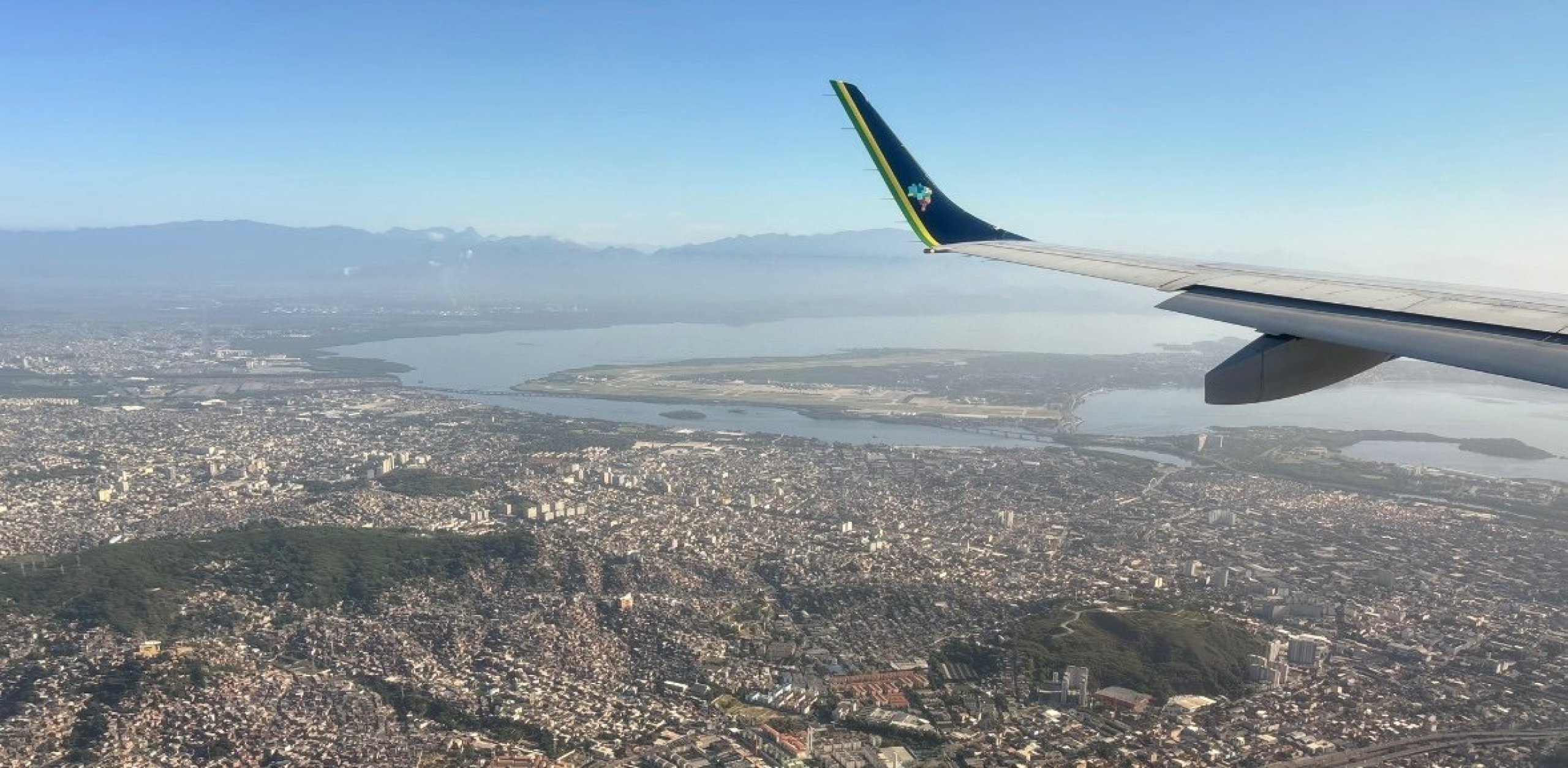 Vista do aeroporto do Galeão na Ilha do Governador durante um voo GRU-SDU em Embraer-195 da Azul Linhas Aéreas.