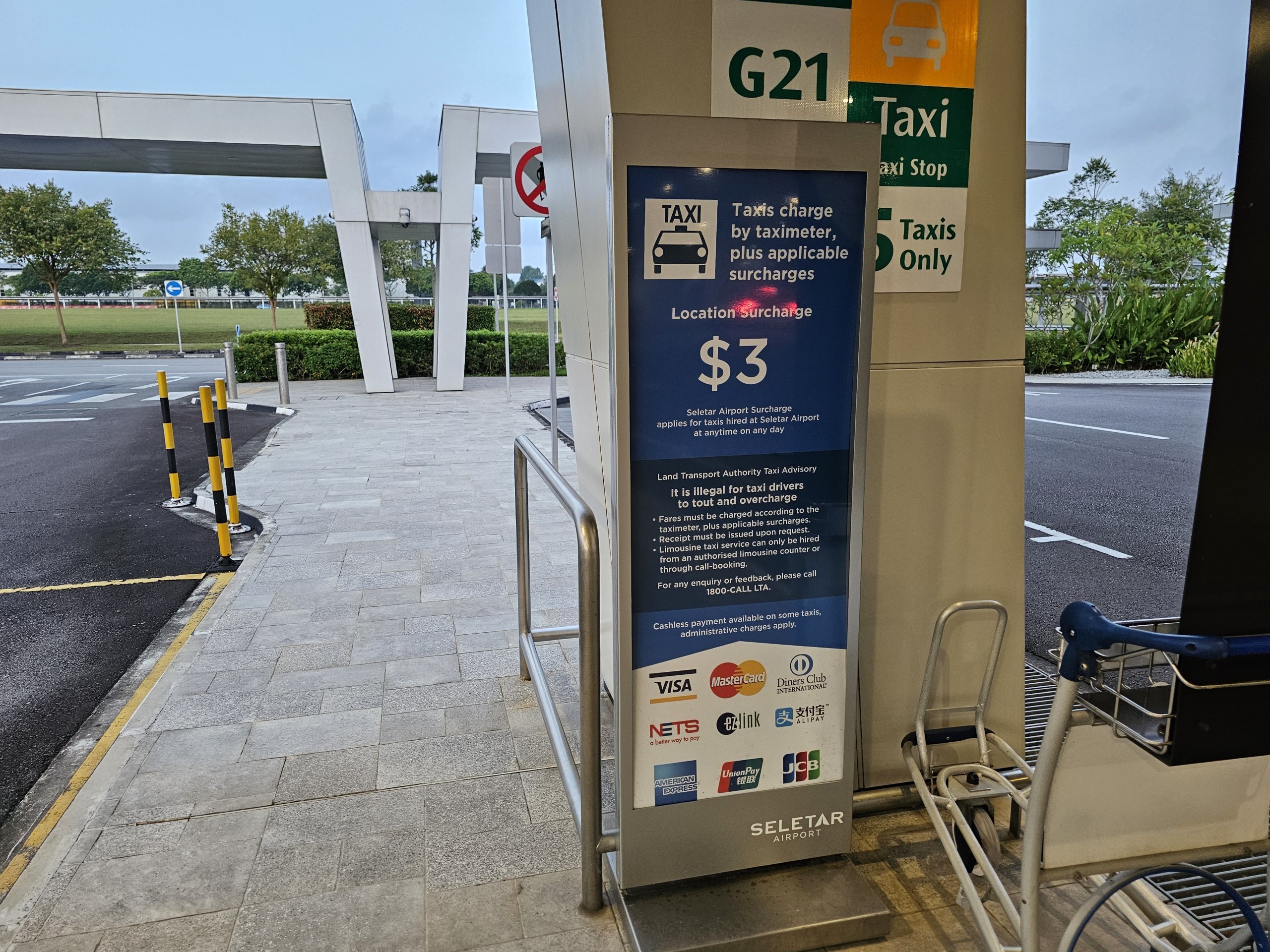 A tarifa de táxi para o centro da cidade é sempre calculada com precisão de acordo com o taxímetro, com uma taxa adicional de 3 sgd para a viagem de/para o aeroporto.