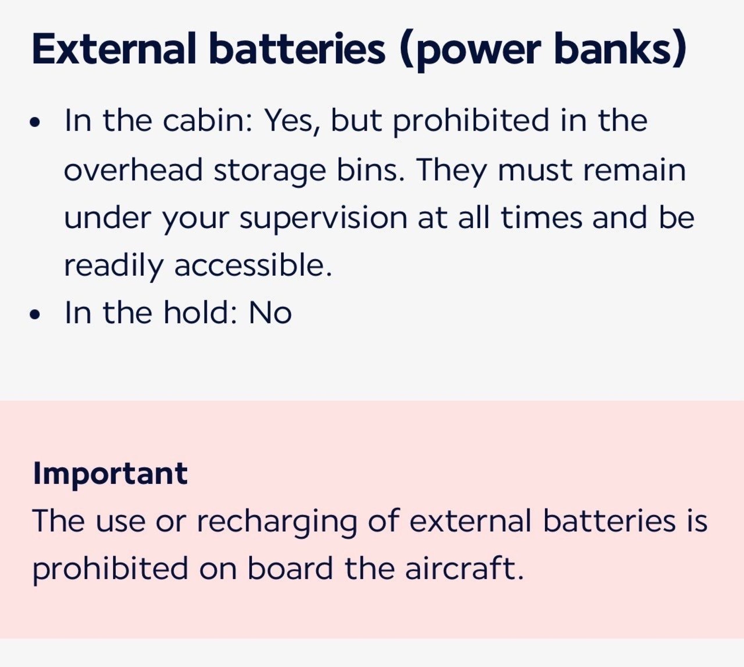 Algumas companhias aéreas permitem um carregador portátil de 160 Wh / 43 200 mAh sem restrições, enquanto noutras companhias aéreas é necessário pedir autorização prévia para transportar um carregador portátil com uma capacidade superior a 100 Wh e inferior a 160 Wh.