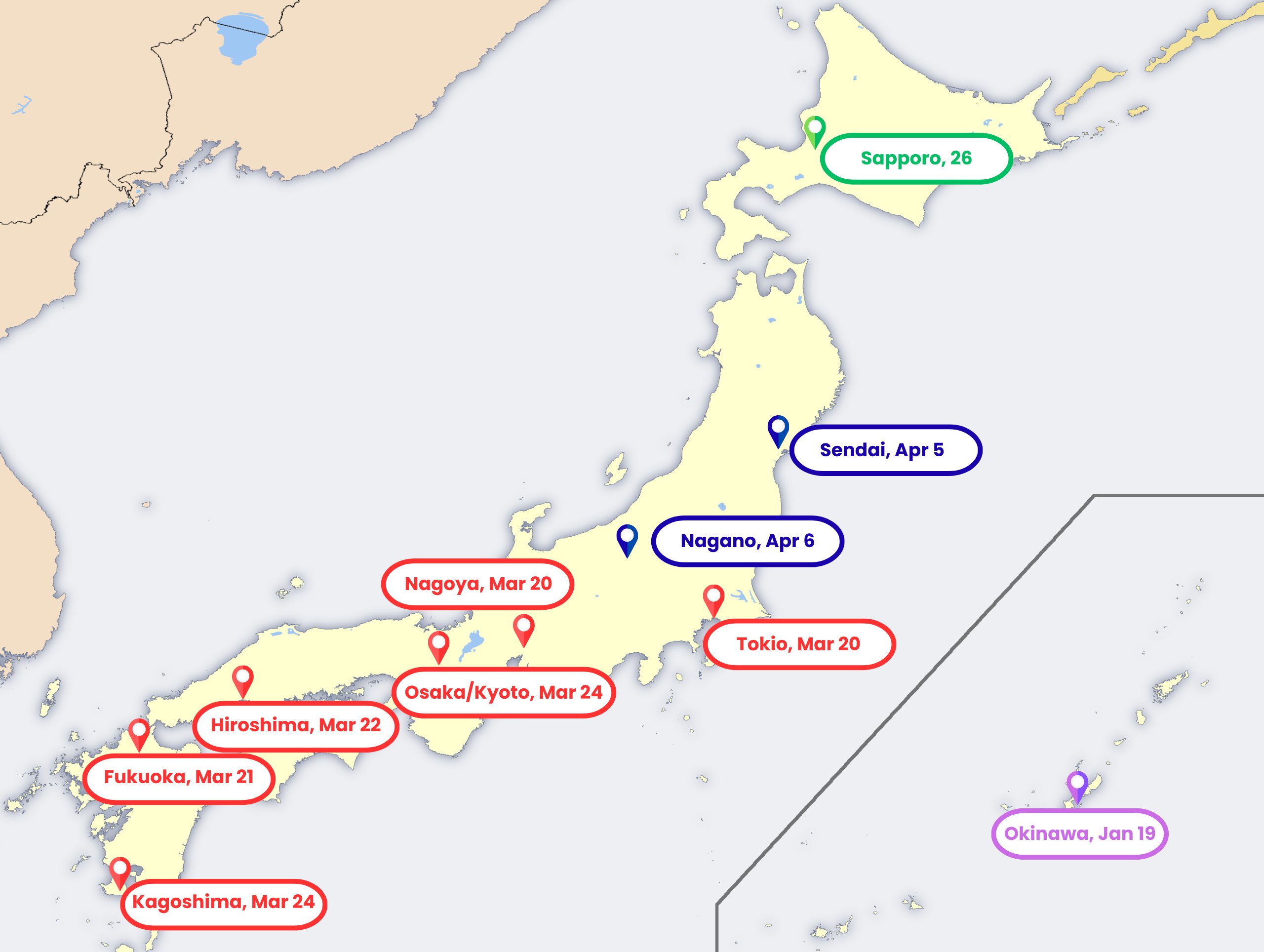 A floração da sakura progride de sul para norte, pelo que as diferenças entre regiões podem ser de várias semanas. O mapa abaixo mostra a progressão típica da estação.