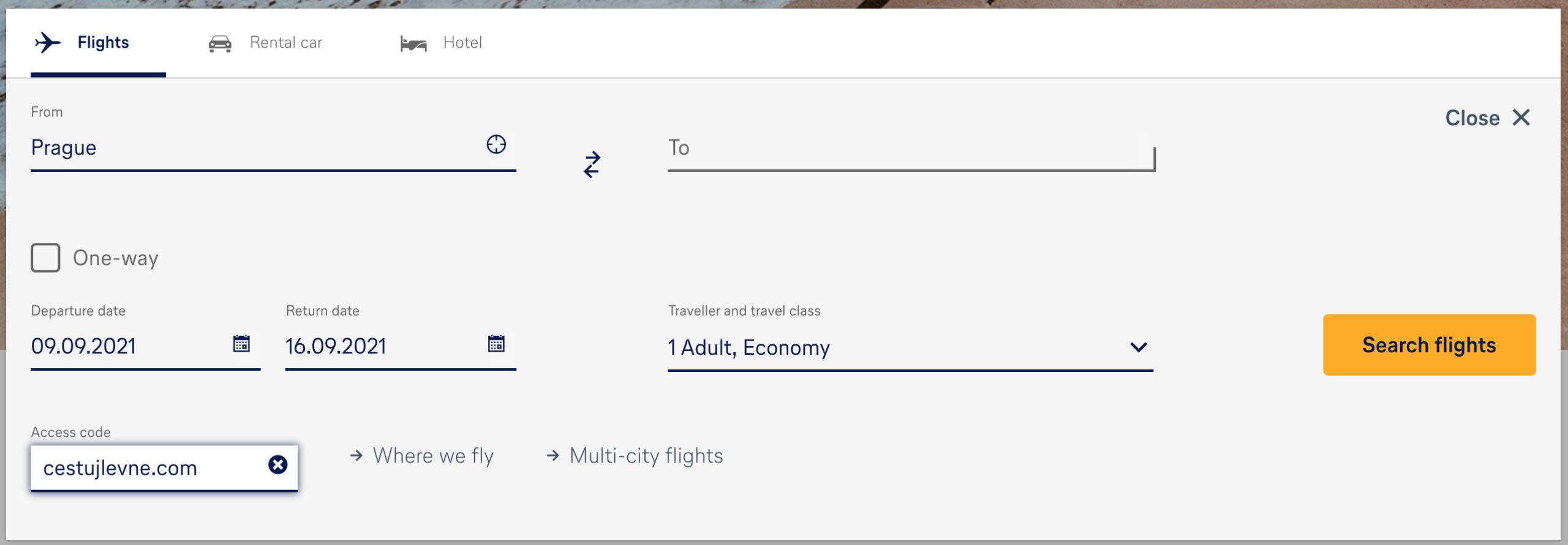 O resgate do desconto no site lufthansa.com é simples e é feito diretamente no motor de busca de voos. Antes de procurar voos para o seu destino, preencha um campo de texto no motor de busca onde é inserido o código promocional.