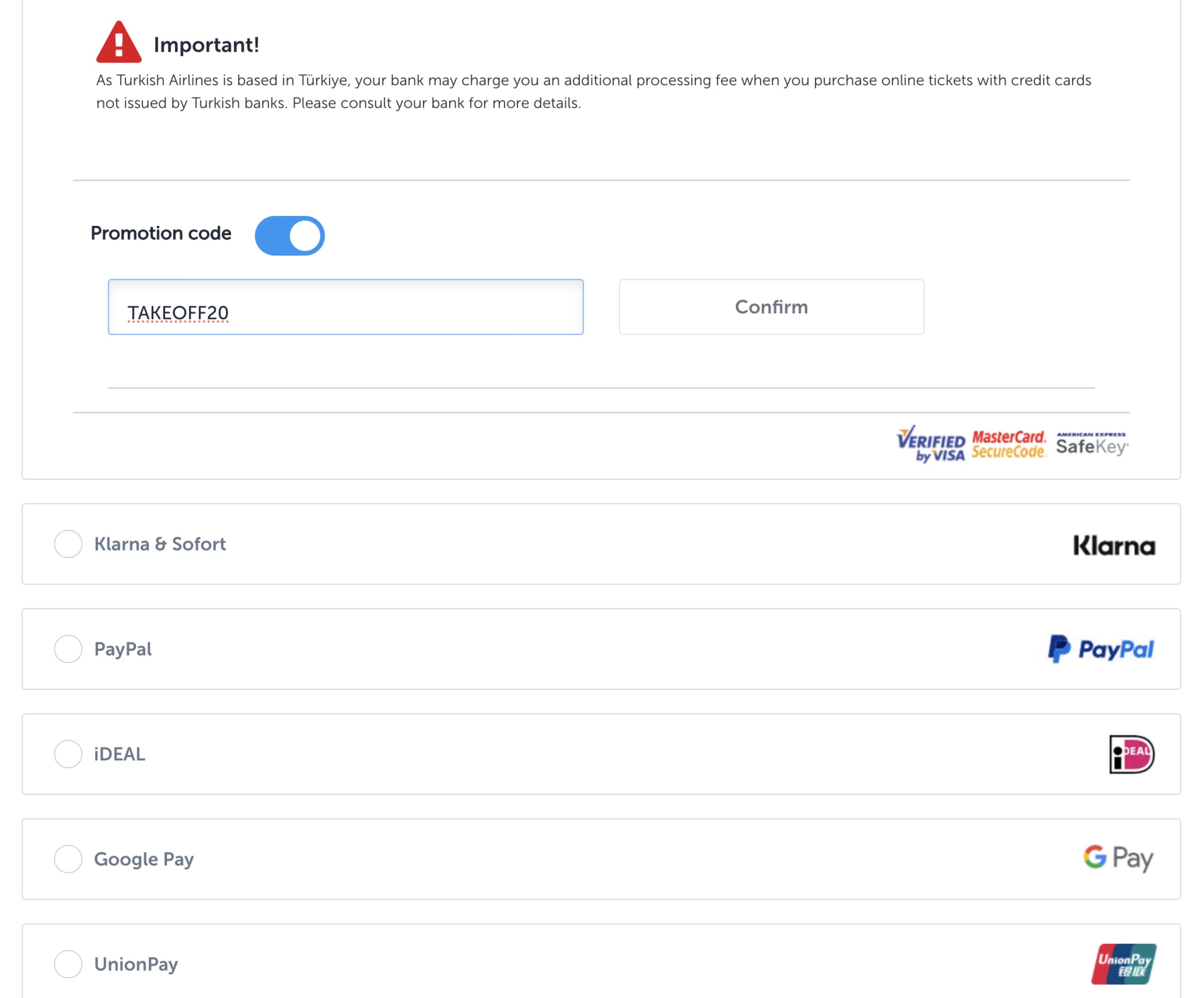 Pode aplicar o código promocional da Turkish Airlines na página de finalização da compra.