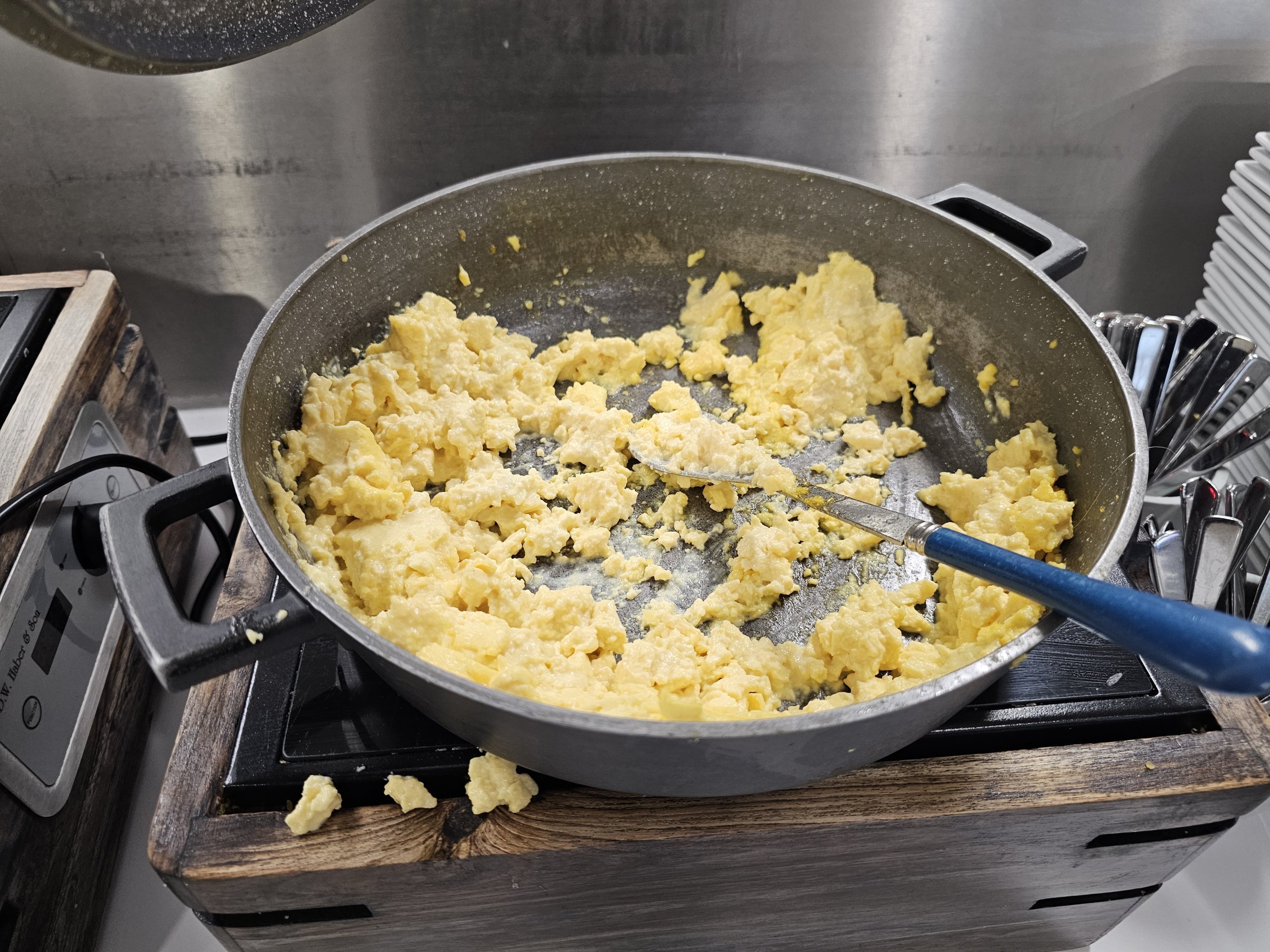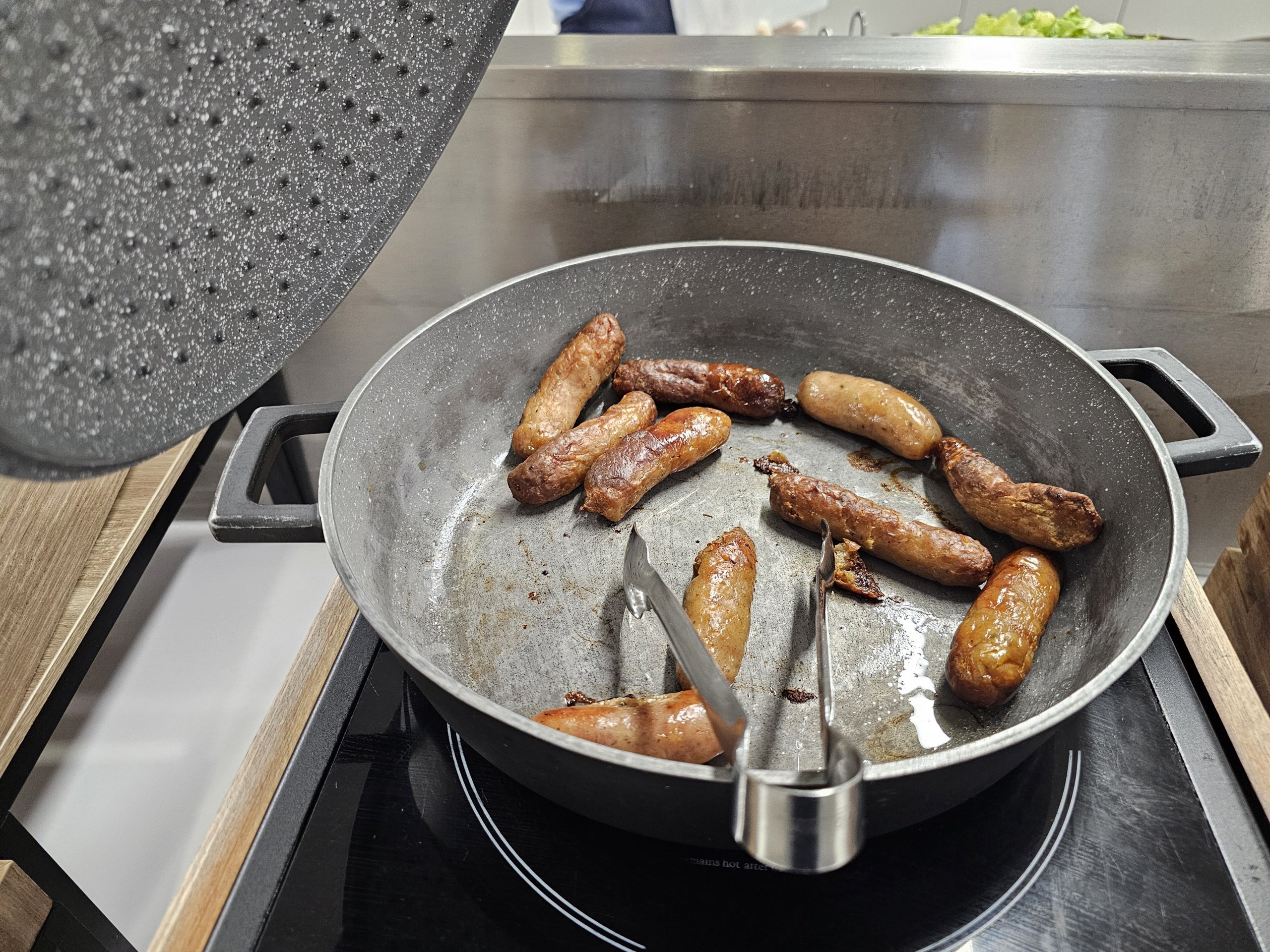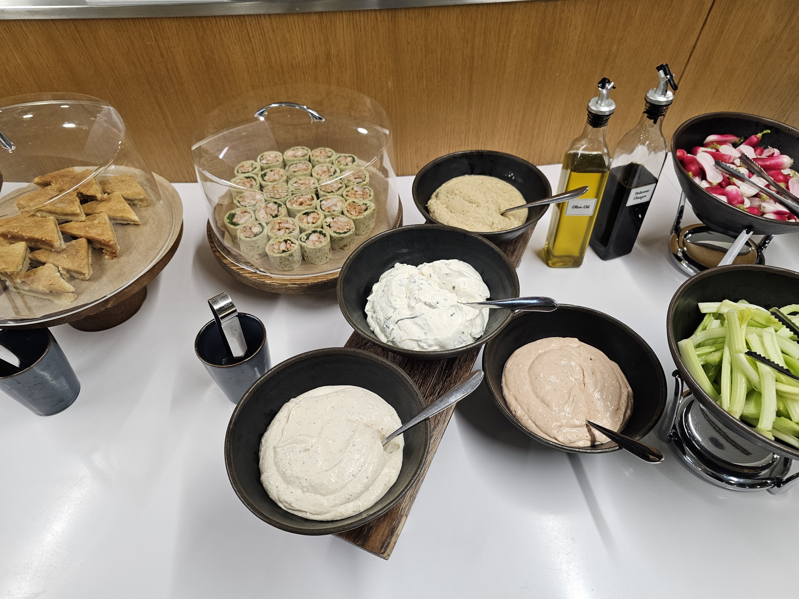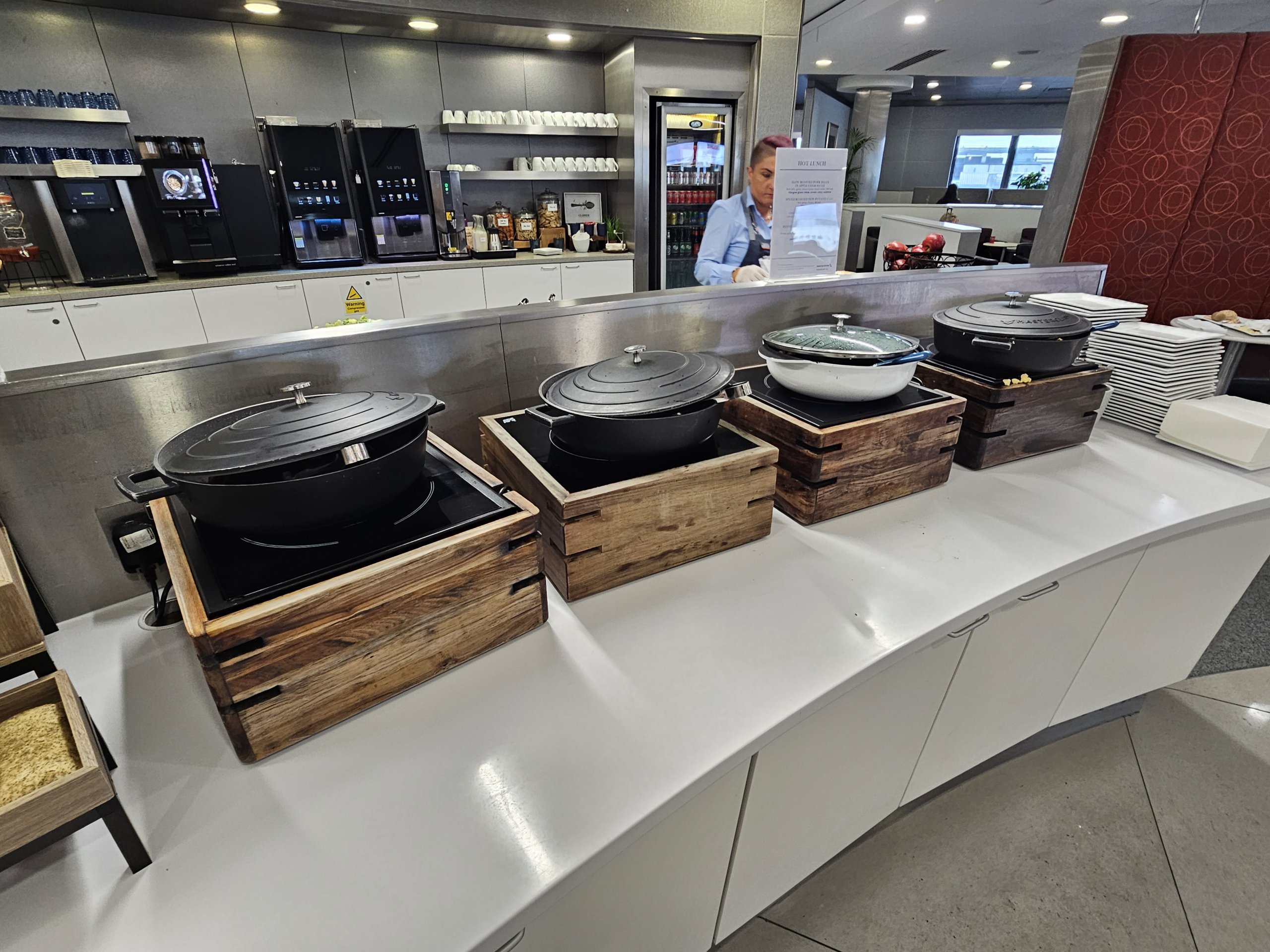 A comida quente tem um menu de pequeno-almoço (até cerca das 11h30) e um menu de almoço (até à hora de encerramento do lounge). A sopa está disponível durante todo o dia.