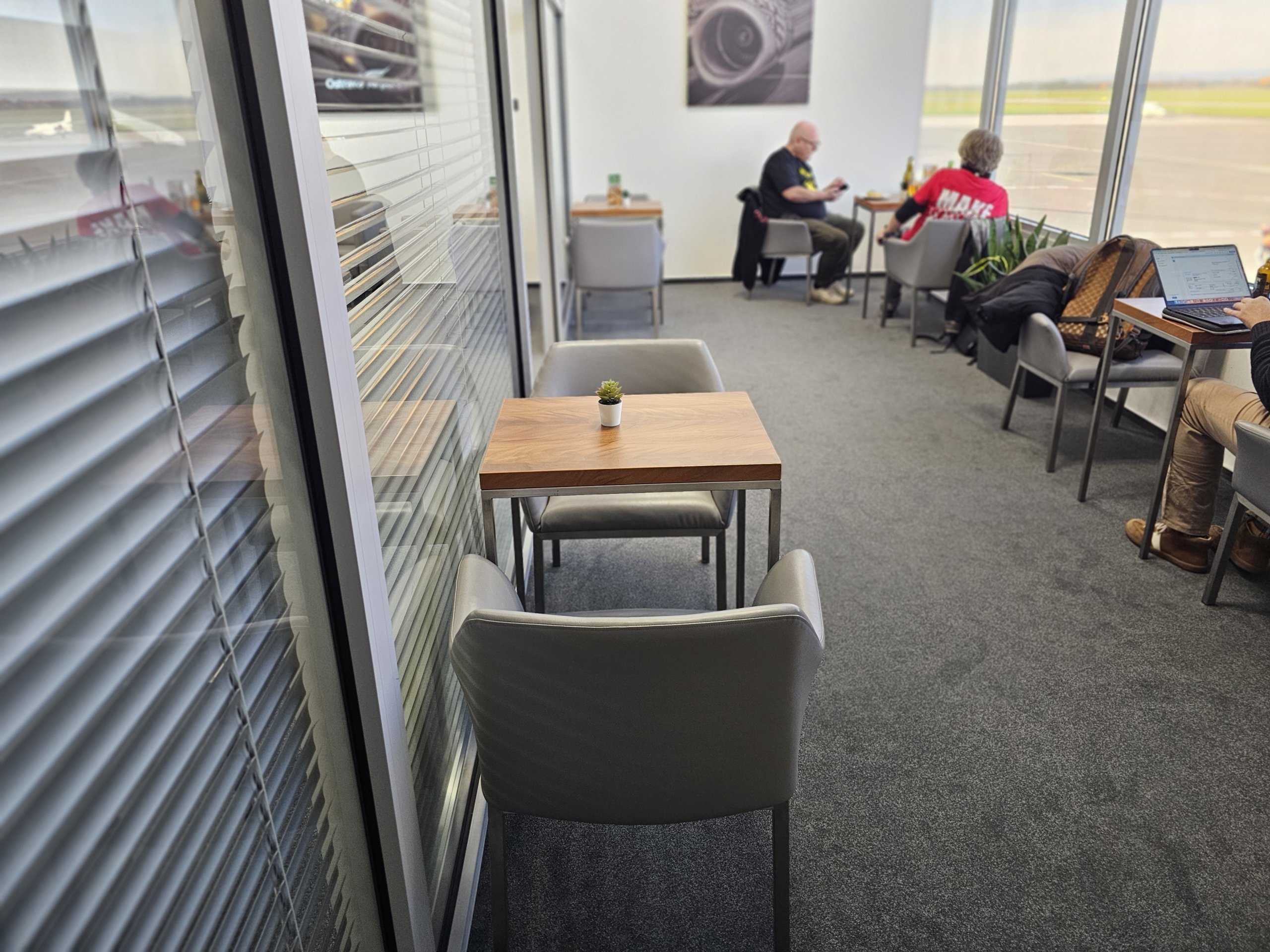 Tem três secções. Há cadeiras confortáveis na sala principal, mas está bastante exposta e, se houver mais pessoas na sala de espera, esta secção é a mais movimentada - os funcionários e outros passageiros estão constantemente a passar por ela.