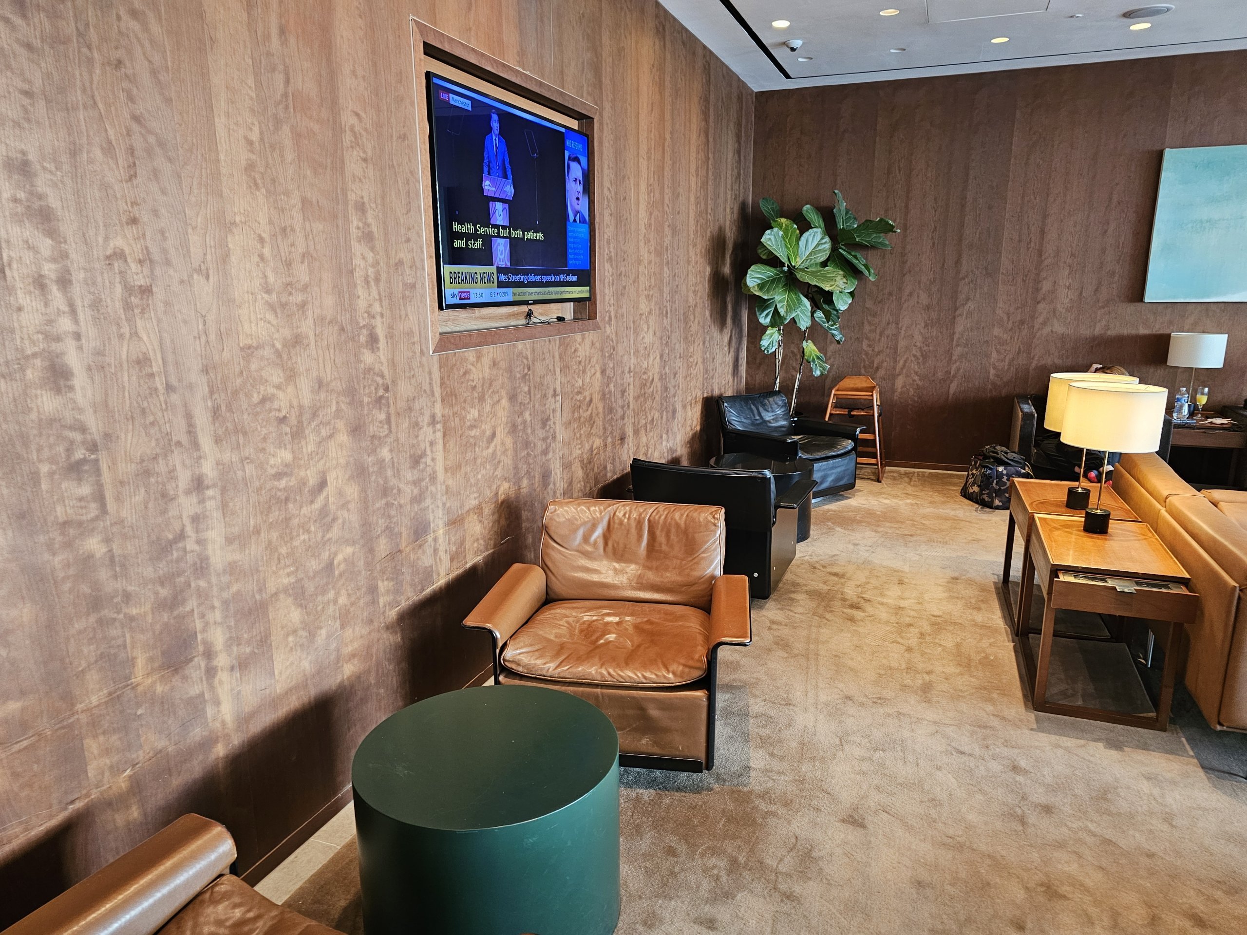 À primeira vista, o que me chama a atenção no lounge é a decoração interior muito agradável em tons de castanho, verde escuro e cinzento.