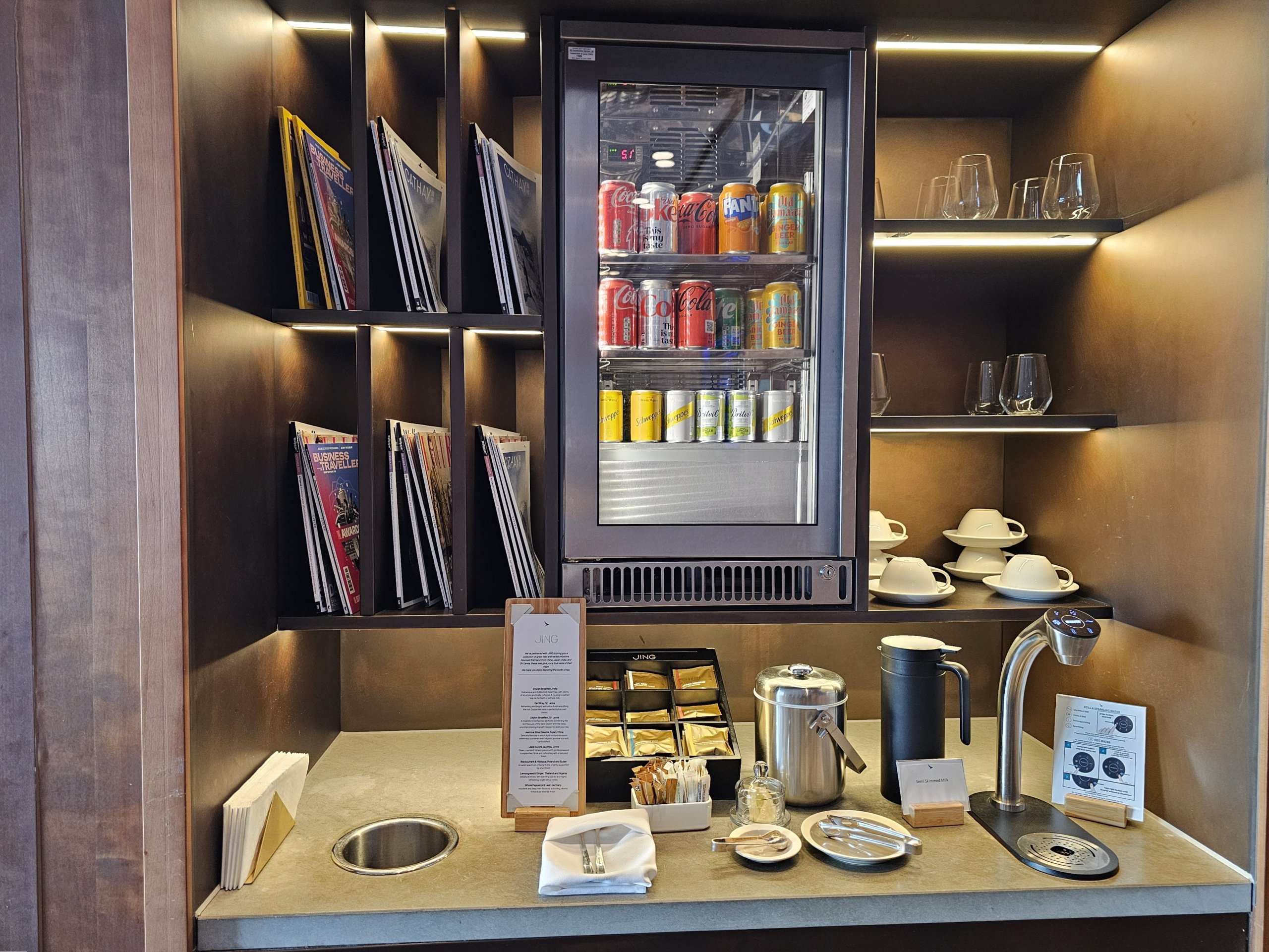 Existem máquinas de café em vários locais do salão e uma seleção bastante extensa de chás Jing.