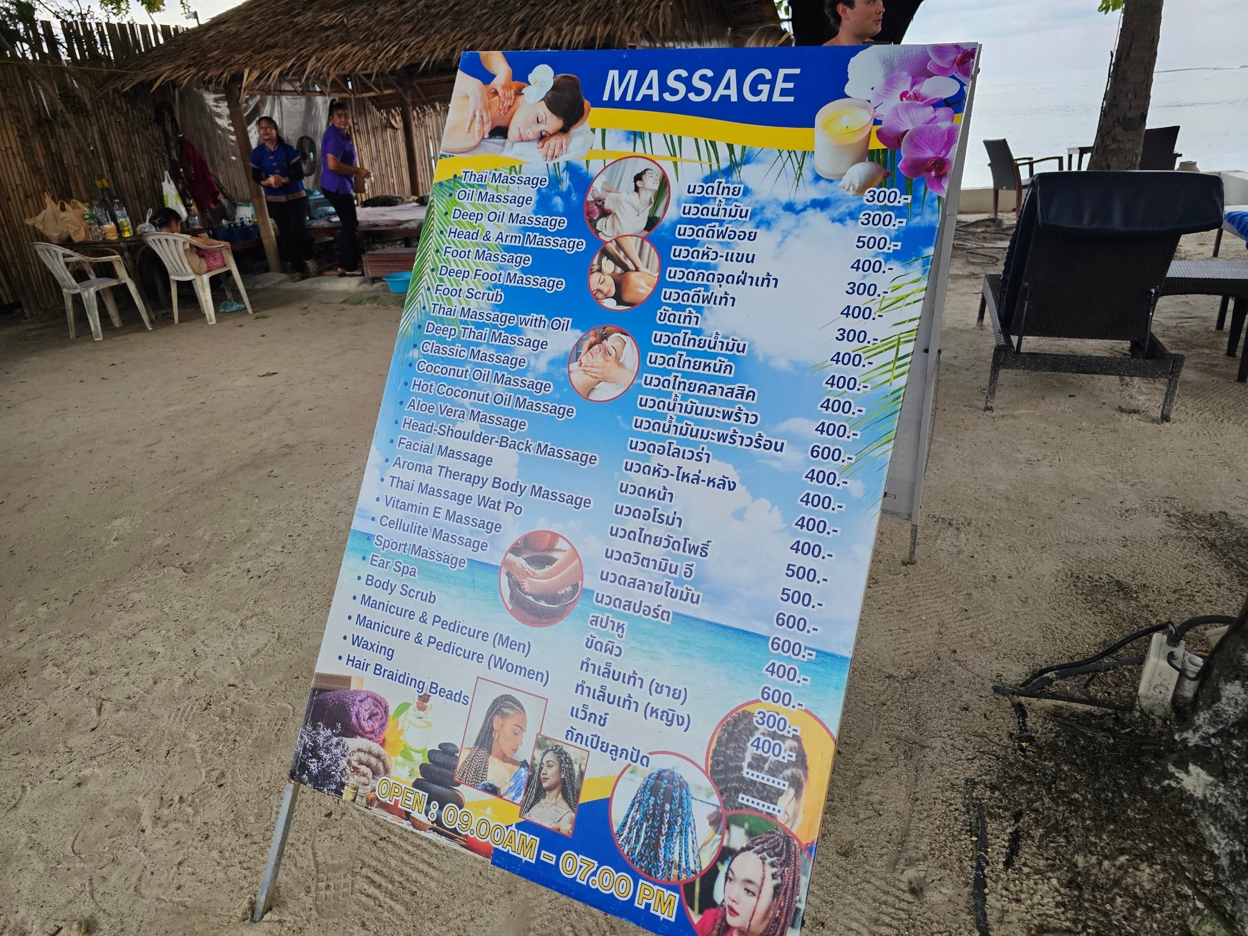 - Massagens - mesmo na praia do hotel, junto à piscina, preços a partir de 300 thb por 1 hora