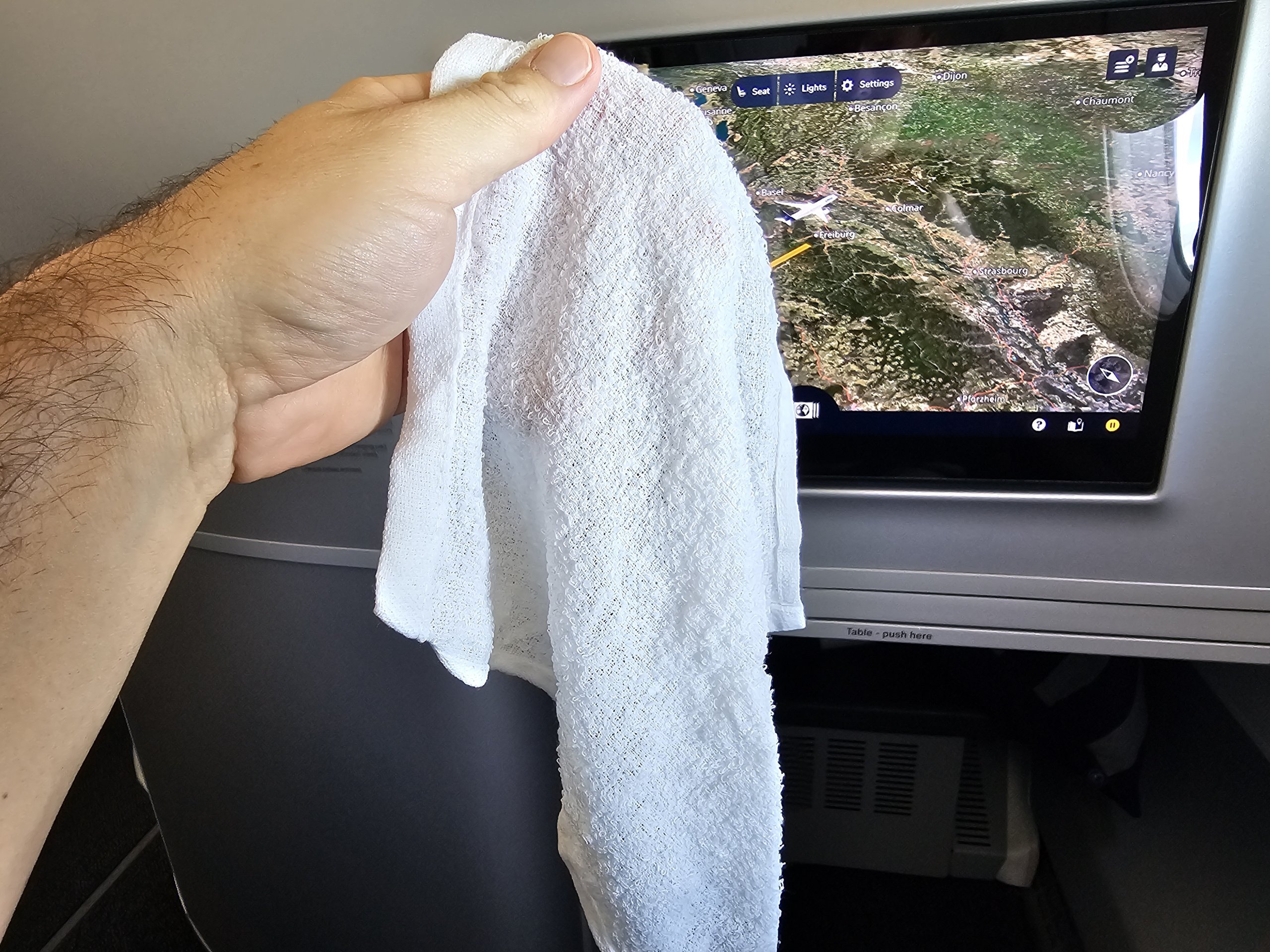 O prato principal chega cerca de uma hora após a descolagem. Antes da refeição, recebemos o tradicional guardanapo molhado quente, que é distribuído mais uma vez antes da aterragem.