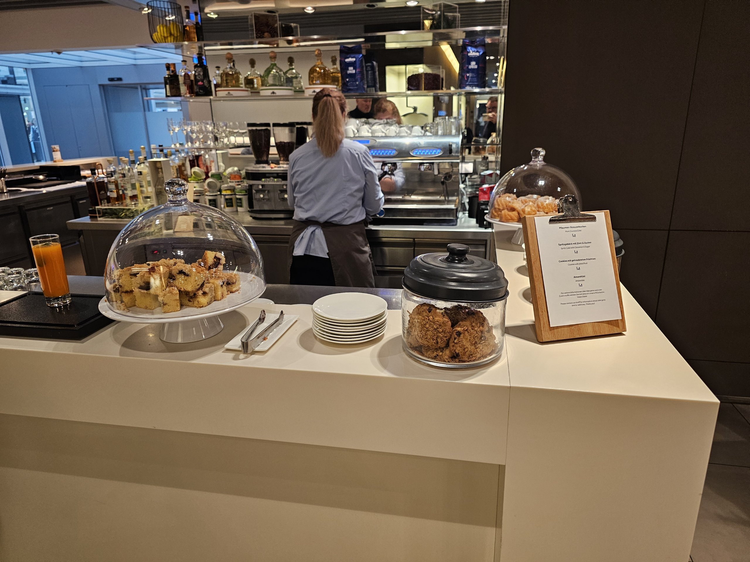 Para ser sincero, não noto grandes diferenças em relação à sala de espera normal da Lufthansa Business Class. A principal diferença é a presença de um bar com uma seleção muito mais vasta de bebidas alcoólicas, mas como bebo muito pouco álcool em viagens a solo, esta mudança não é de todo significativa para mim.