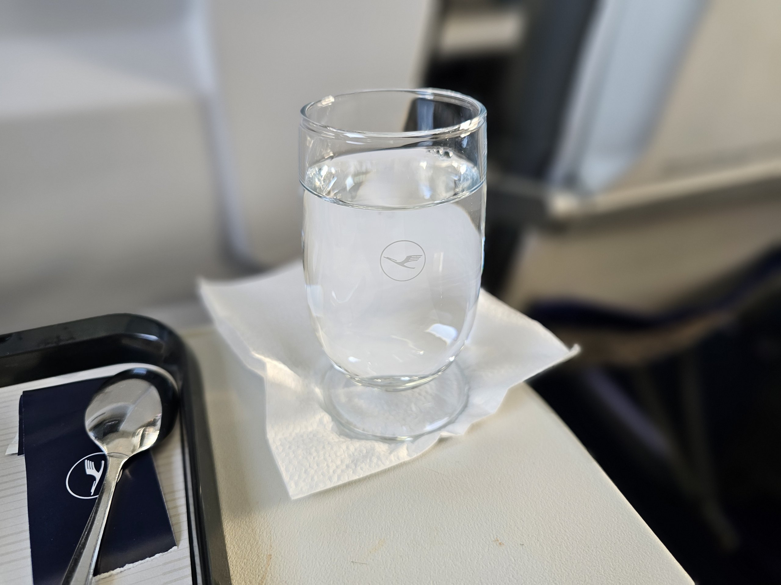 A bebida de boas-vindas continua a ser normal, com uma escolha de champanhe, sumos sem álcool, cocktail de assinatura da Avionic ou água. Para este voo, optei apenas por água.