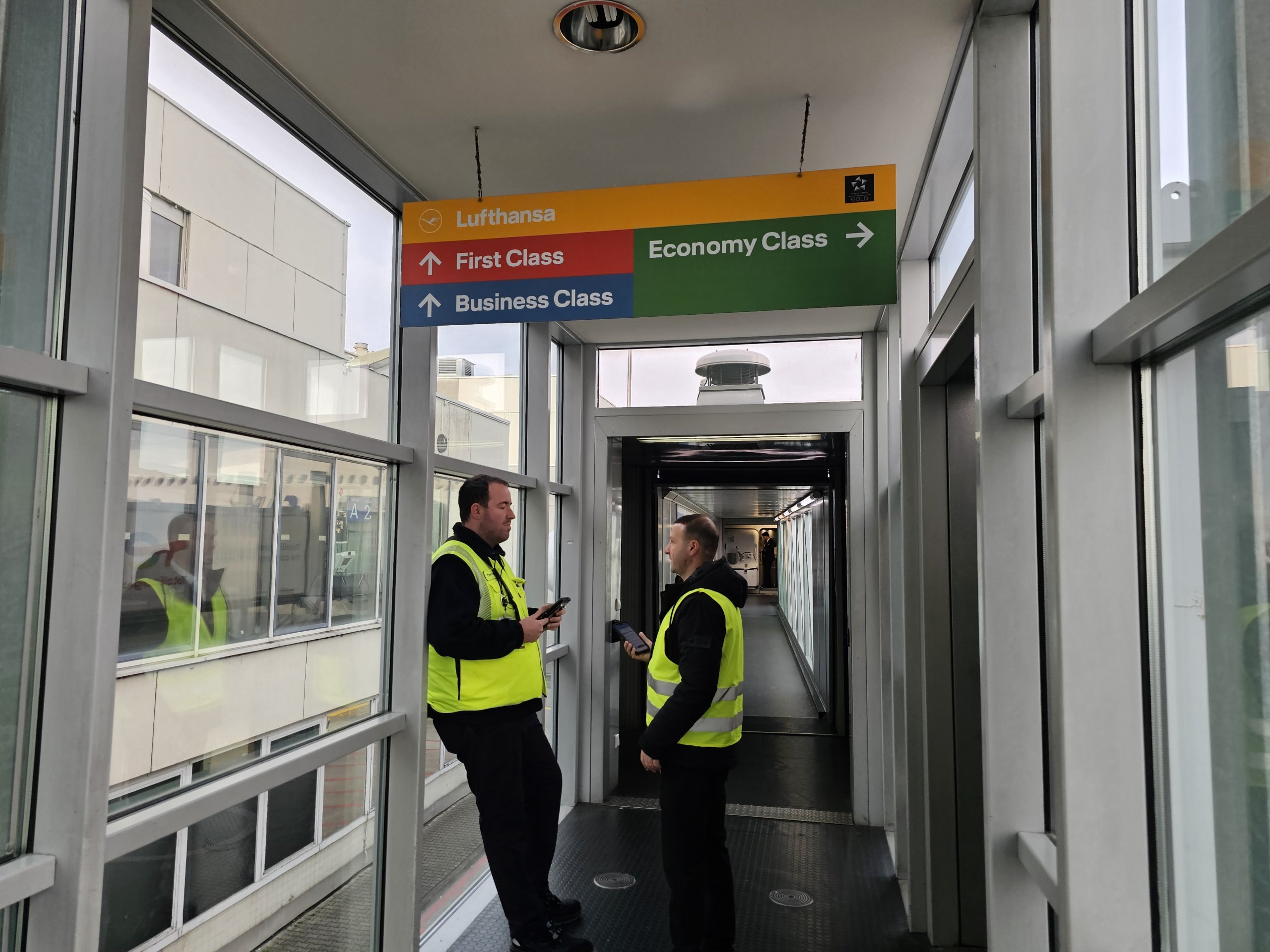 Saímos do carro na pista, onde entramos no elevador que nos leva à ponte de embarque normal.