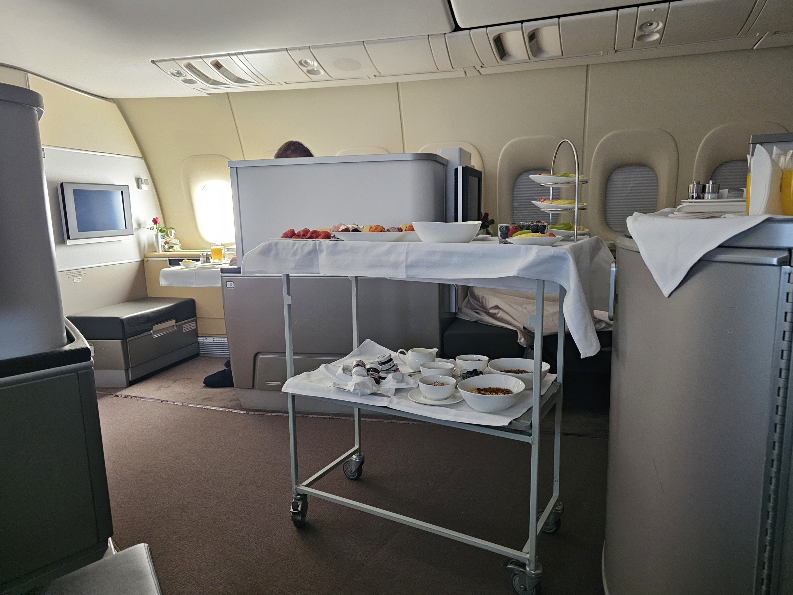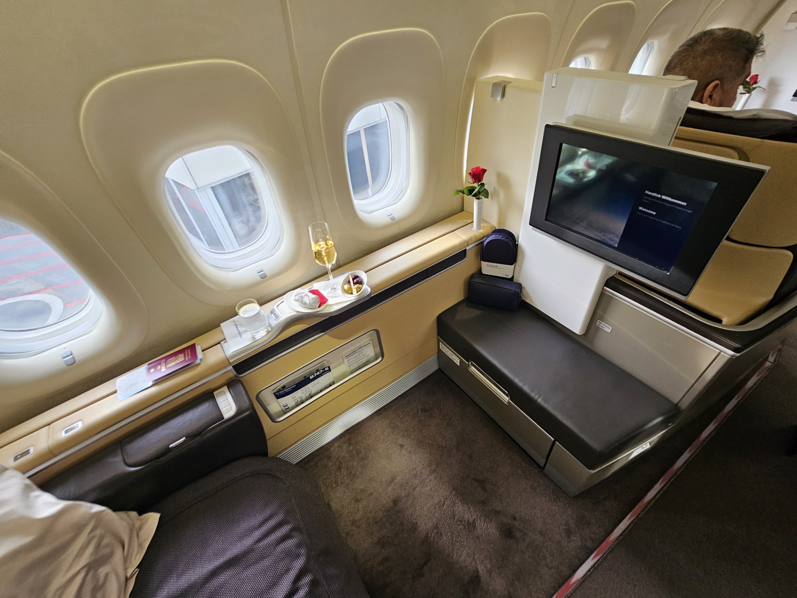 O serviço e o atendimento a bordo são, diria eu, medianos, talvez ligeiramente acima da média para os padrões da primeira classe. As companhias aéreas do Médio Oriente ou do Sudeste Asiático têm simplesmente um serviço um pouco melhor.