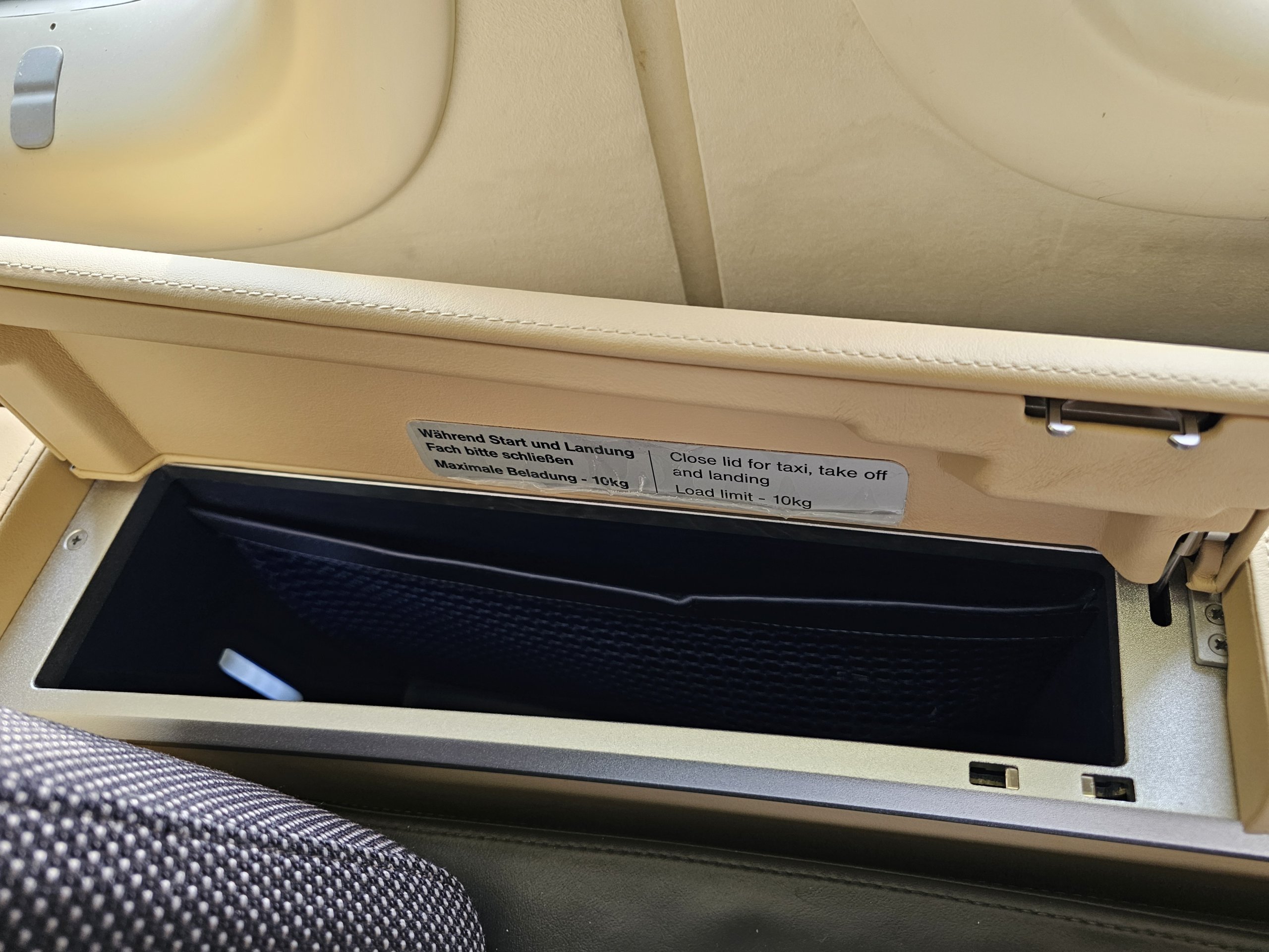 Tenho dois compartimentos espaçosos entre o assento e as janelas, onde cabem todos os meus documentos, como o passaporte e os cartões de embarque, mas também um menu impresso de grandes dimensões ou auscultadores de grandes dimensões.