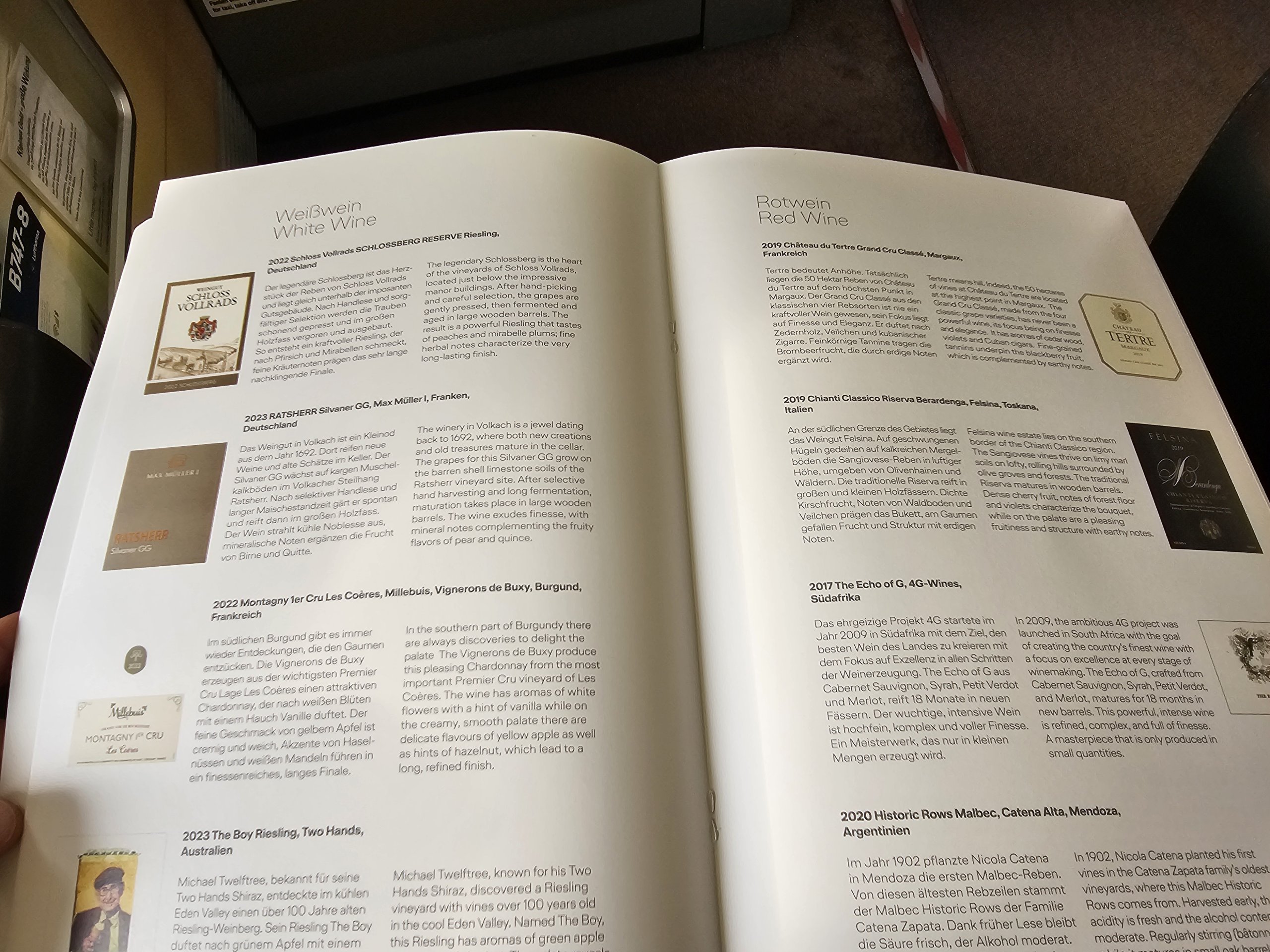 Antes da partida, todos os passageiros recebem um menu impresso e uma lista de vinhos muito completa.