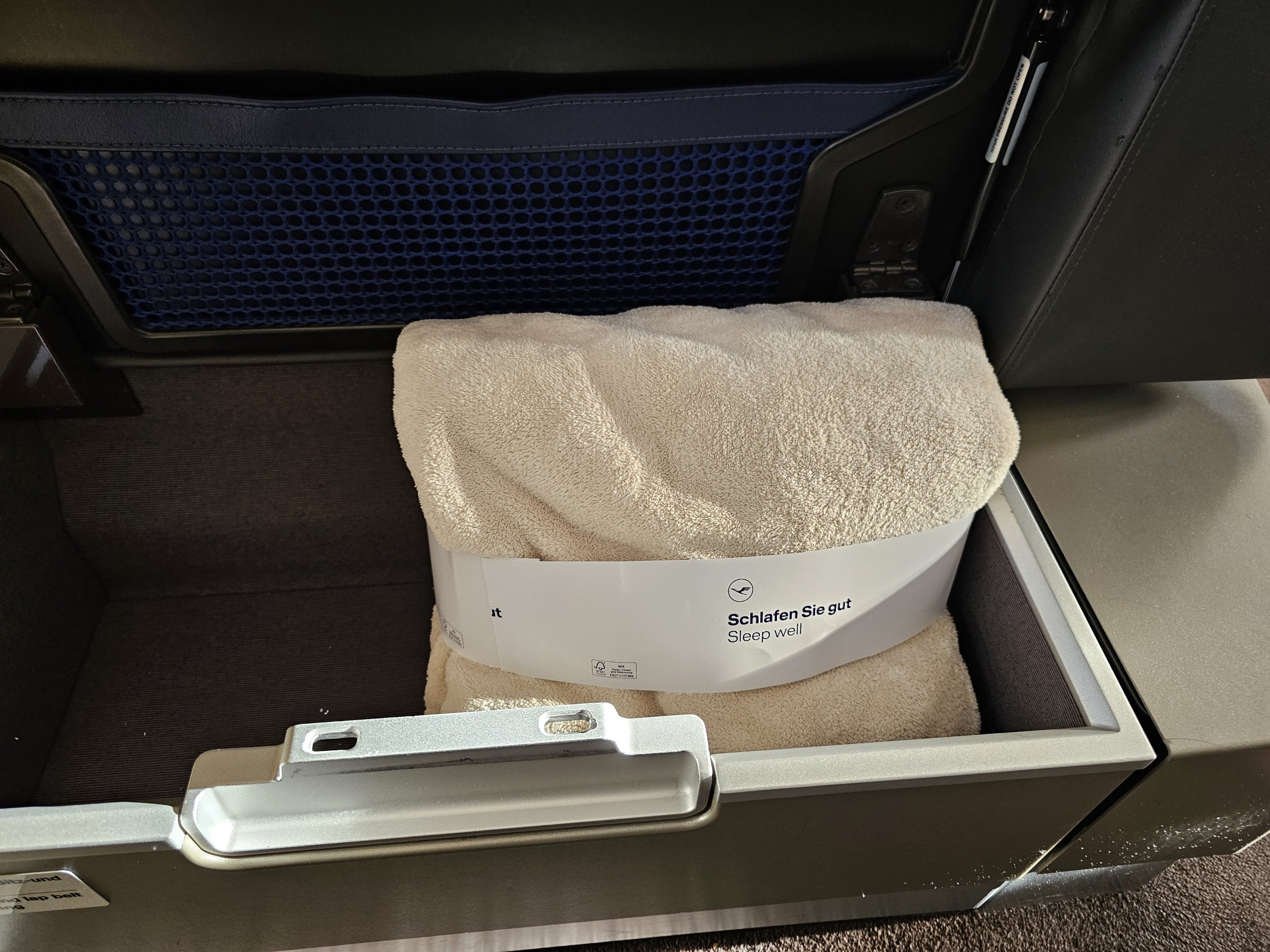 O assento está equipado com uma almofada e uma manta extremamente confortáveis, que podem ser utilizadas em qualquer altura do voo. Para dormir, a tripulação dá-lhe outro cobertor e roupa de cama.