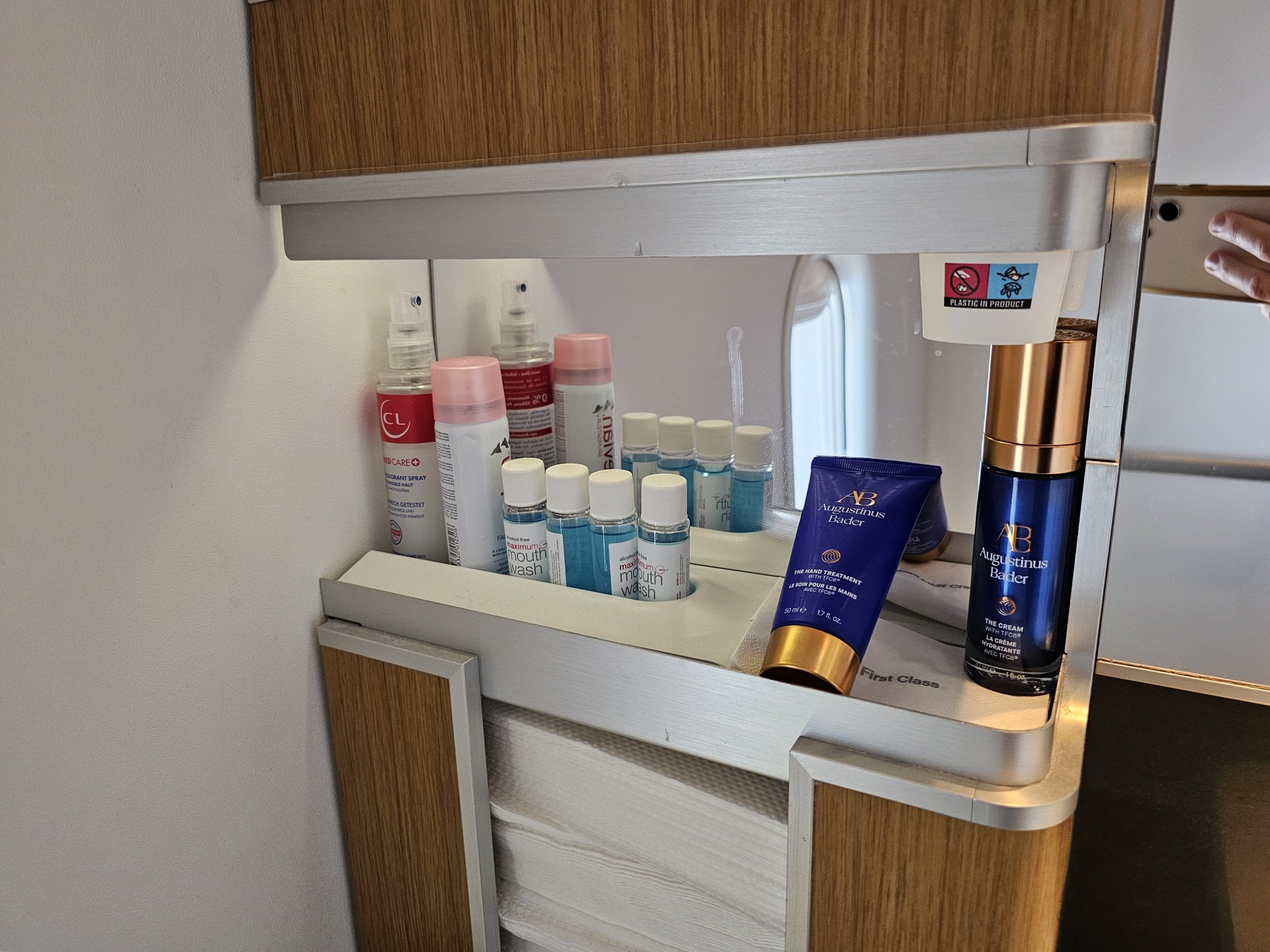 Pode levar livremente frascos de elixir bucal, toalhetes húmidos ou cremes para as mãos nas casas de banho exclusivas da primeira classe.