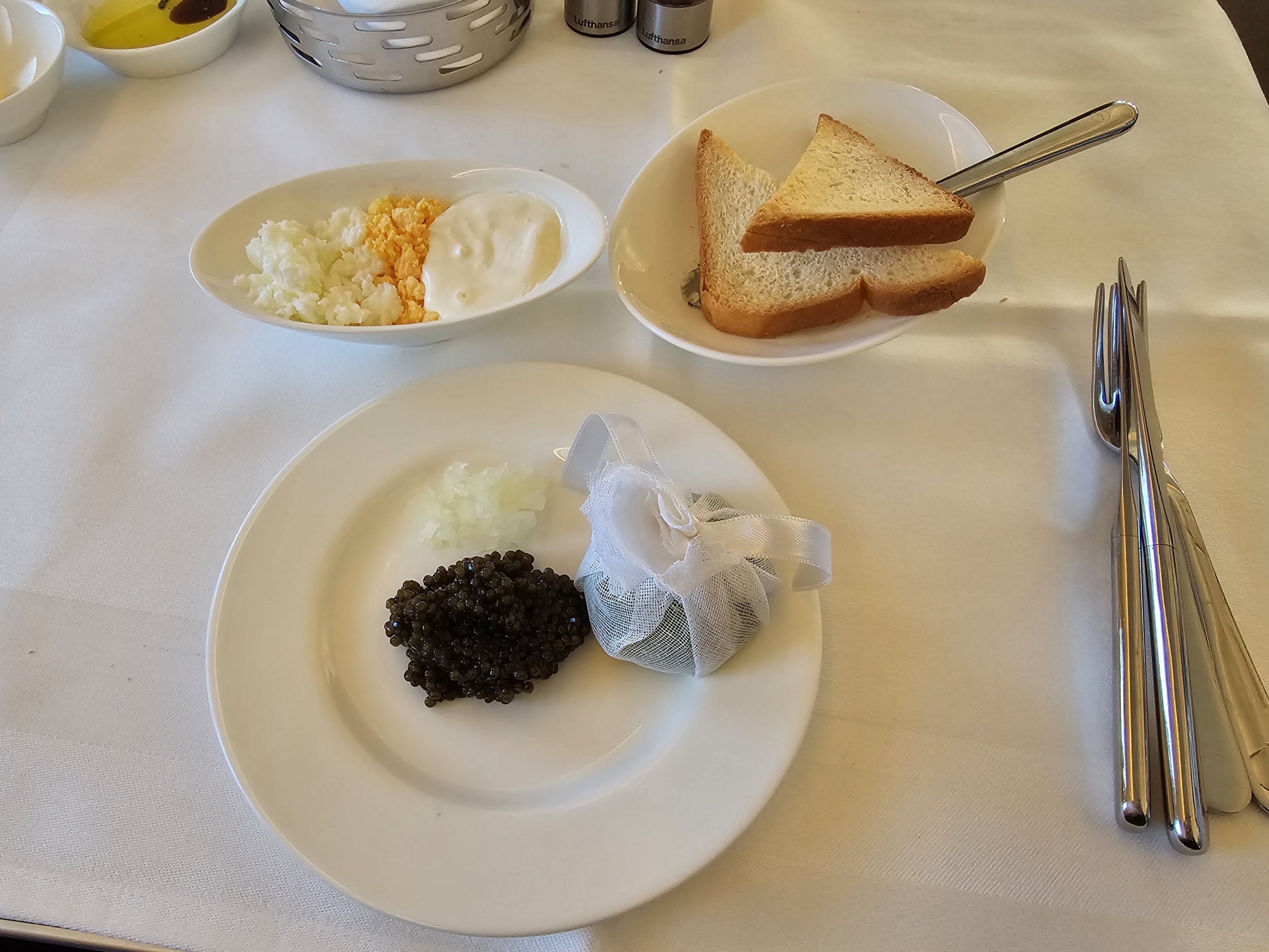 Ainda antes do serviço principal, vem o caviar - o produto de assinatura da Lufthansa na primeira classe. O serviço de caviar é simplesmente um conceito desta companhia aérea com o qual todos os passageiros regulares e entusiastas de voos estão familiarizados.