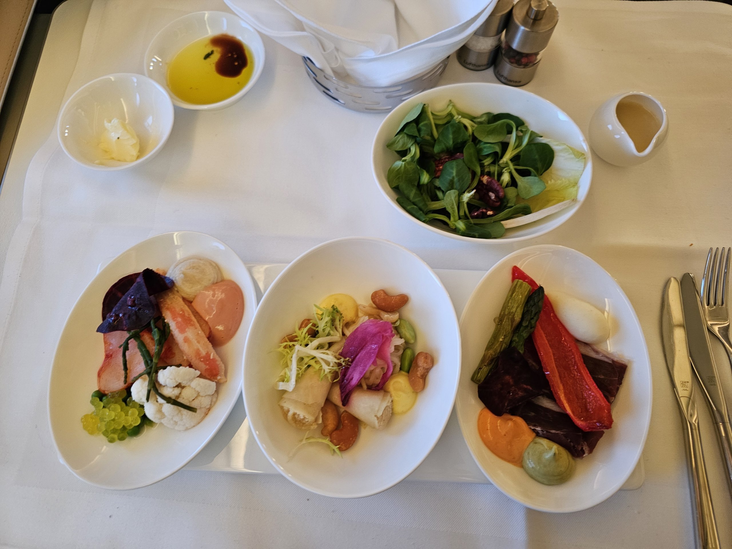 A entrada é muito fresca, colorida, leve e deliciosa! Gosto da apresentação e, em comparação com o serviço de classe executiva, há mais comida e muito mais variedade.