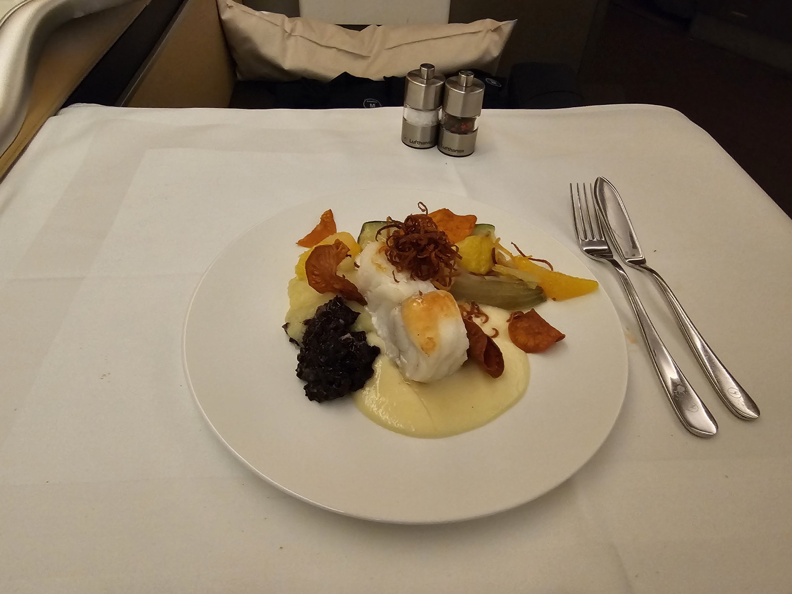 Para o prato principal, escolhi o peixe - tamboril - com molho Beurre Blanc. Desta vez, a apresentação para mim é muito pior do que a das entradas, mas o prato é saboroso e, acima de tudo, leve. Exatamente como imagino durante um voo de longo curso.