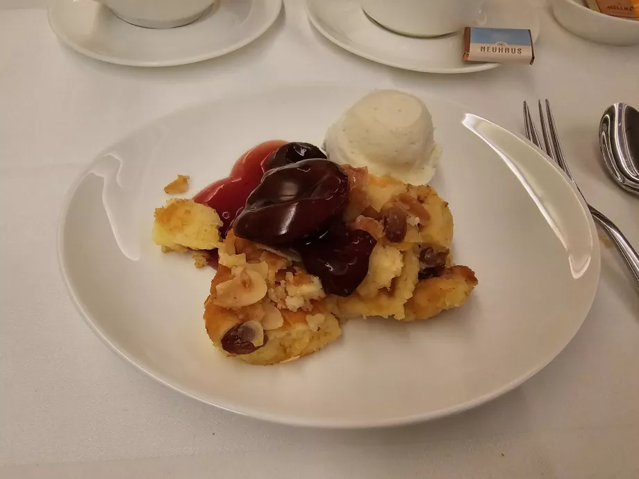 Adoro o tradicional Kaiserschmarren alemão. Aqui, recebo-o com molho de ameixa e um fabuloso gelado de baunilha. Acho que nunca comi uma bolacha César melhor.