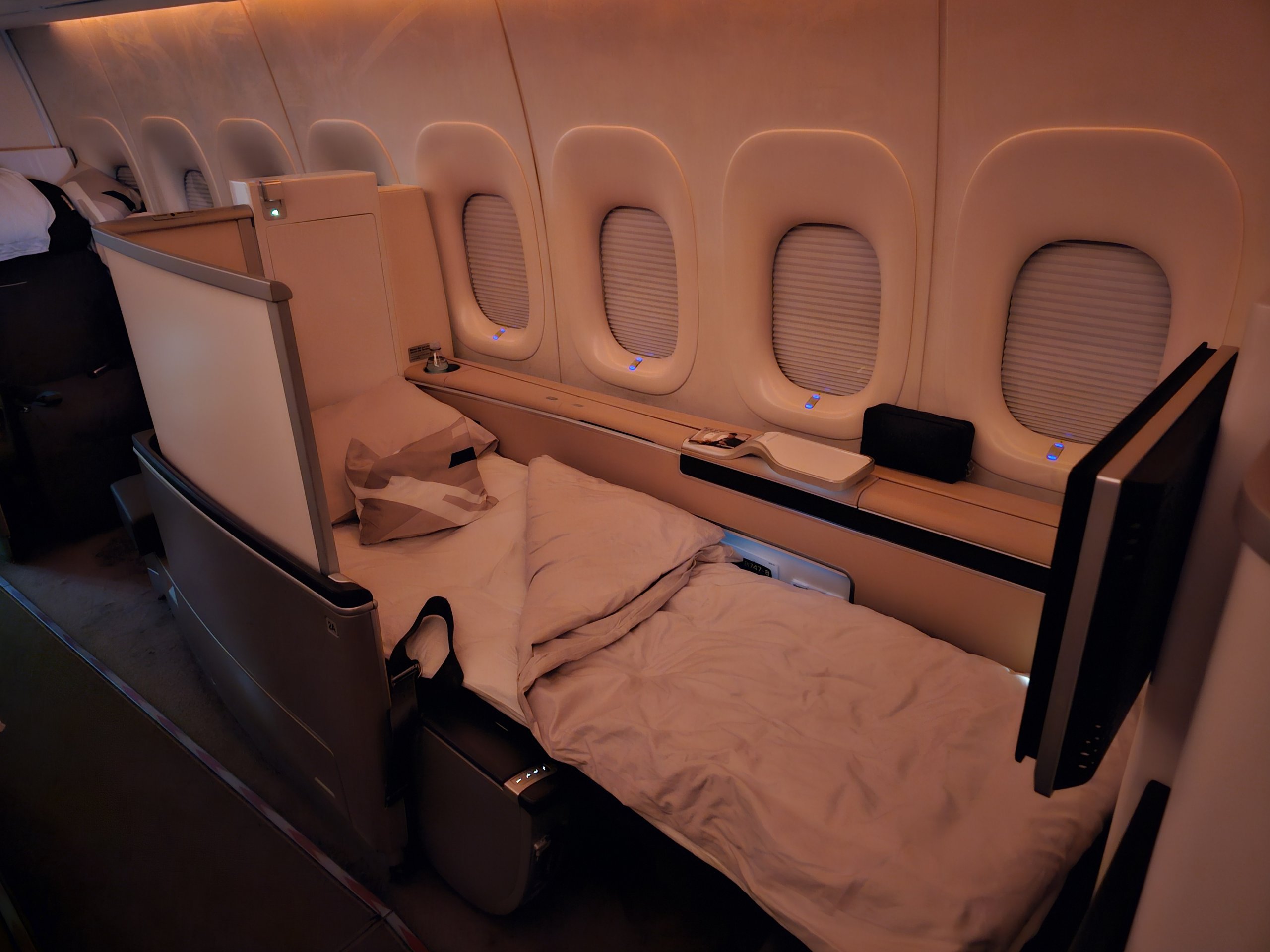 Lá, voei no antigo produto num Boeing 747-8 e regressei na novíssima Allegris First Class num Airbus A350-900.
