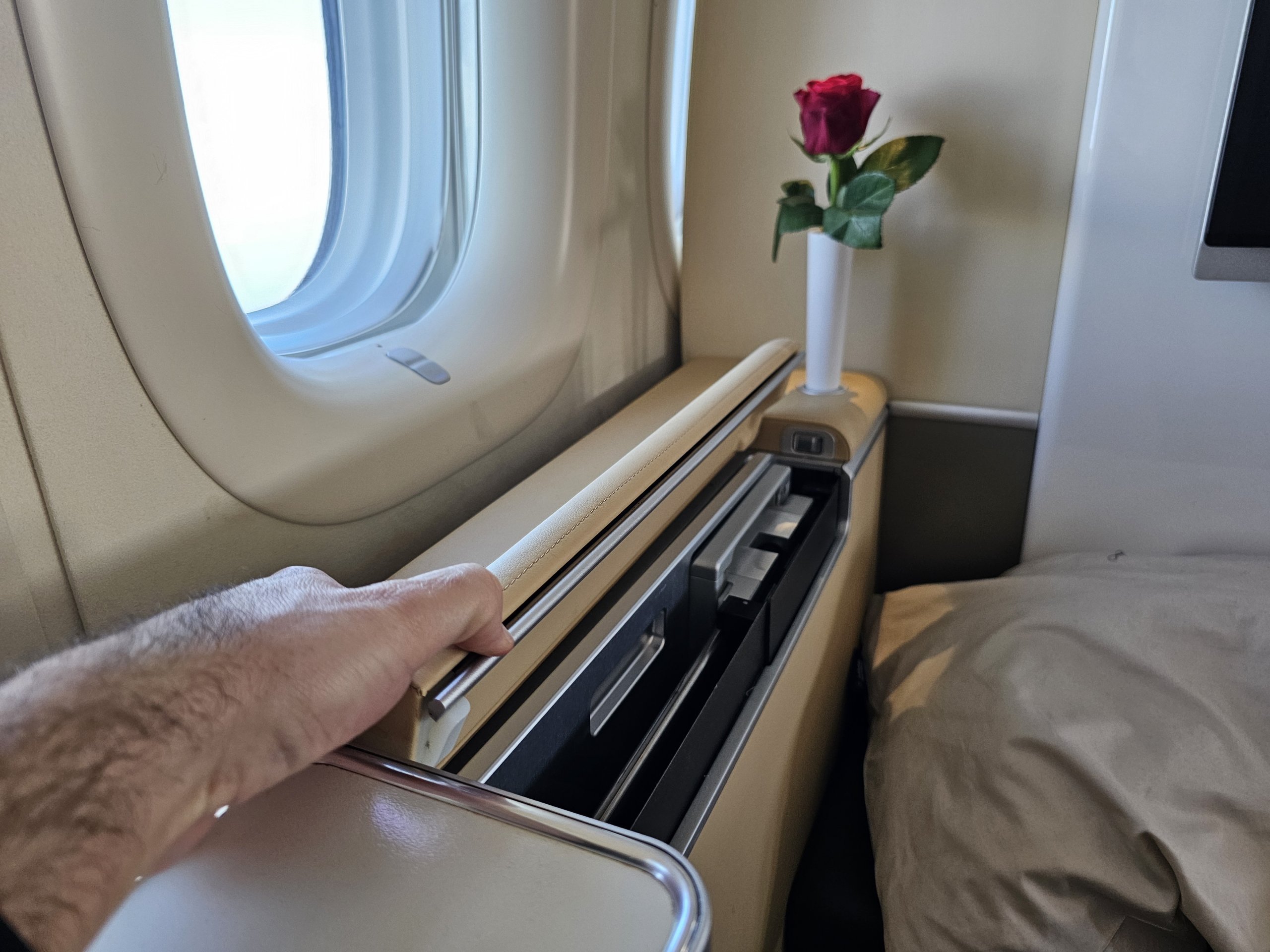 Aprecio muito o enorme espaço de arrumação, que é incomparavelmente maior do que o do novo Allegris First Class do Airbus A350.
