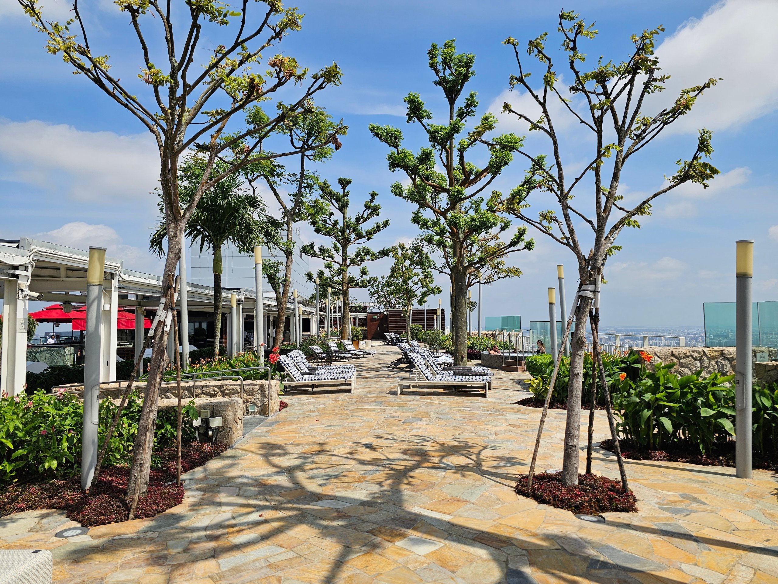 As espreguiçadeiras também estão localizadas no outro lado do telhado, onde não há piscina e é mais tranquilo.