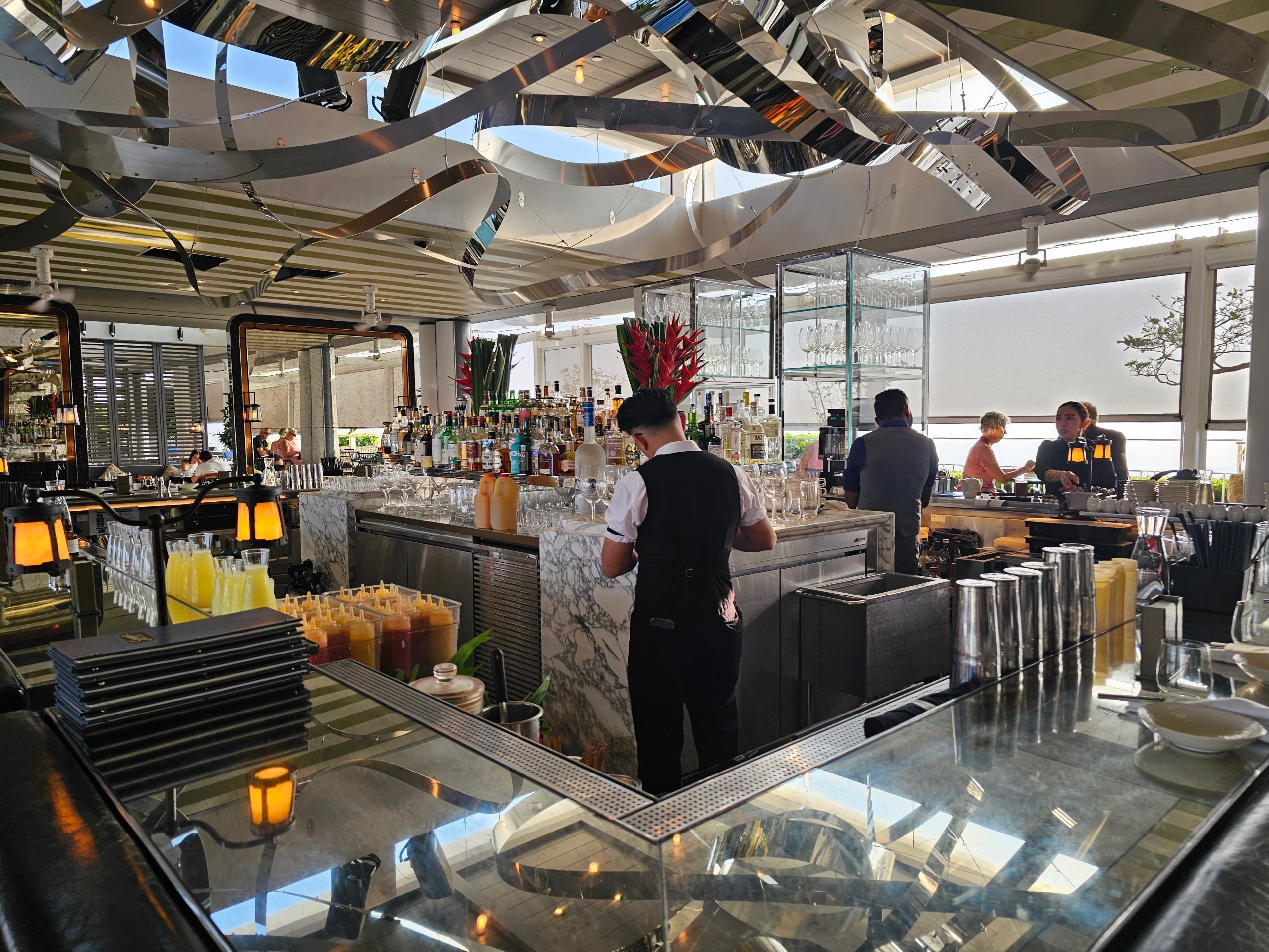 Pequeno-almoço servido no Spago Bar, mesmo junto à icónica piscina do último piso.