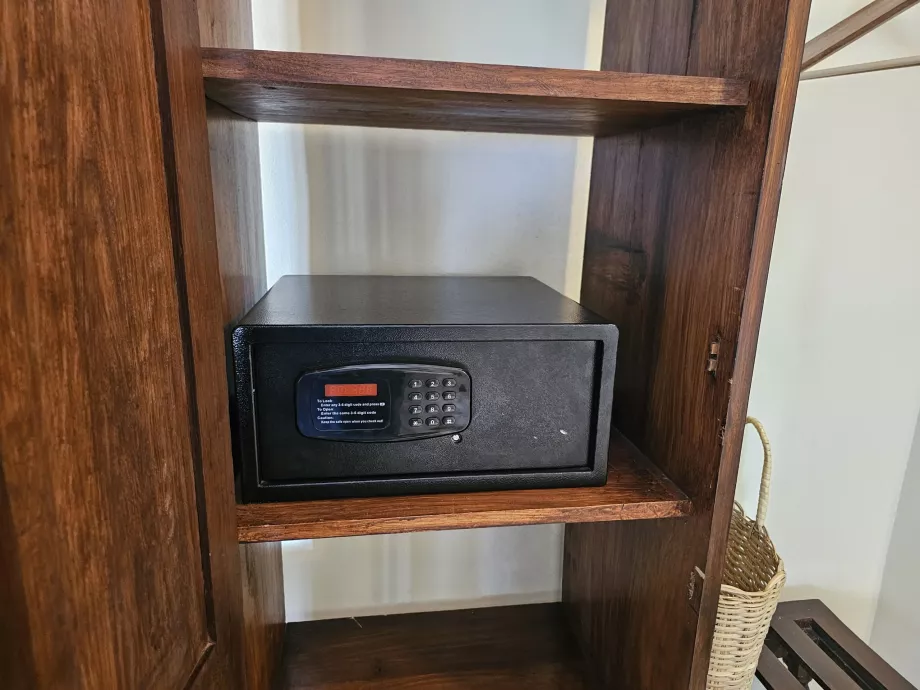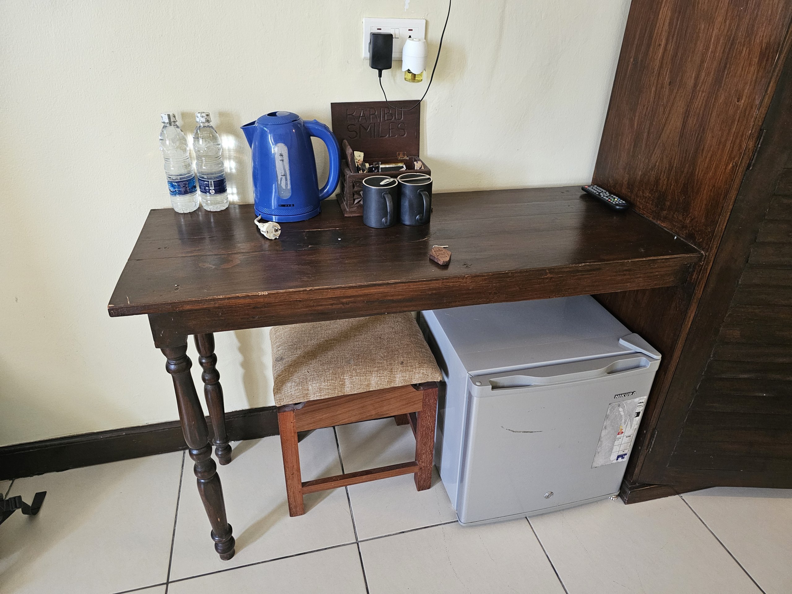 Também no quarto encontrará um cofre, toalha de praia, chaleira, café e chá instantâneos.