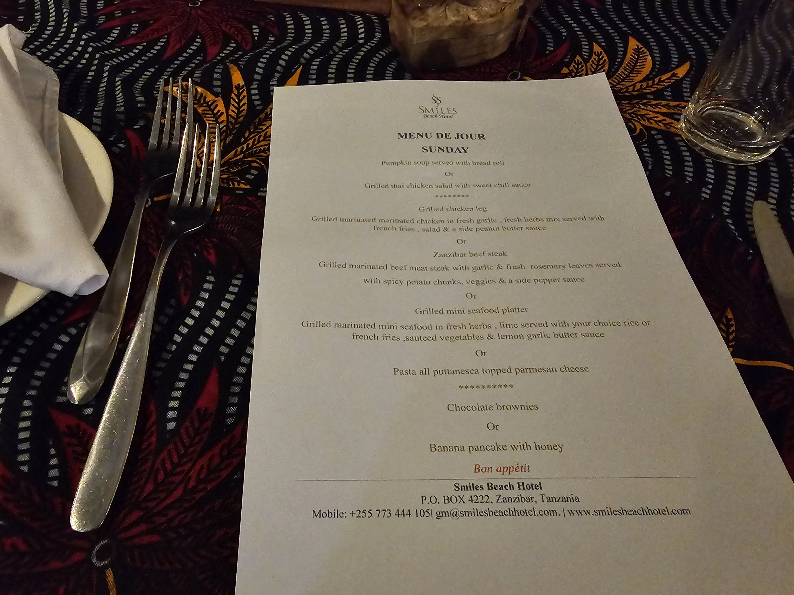 À primeira vista, o menu é muito pobre, mas em comparação com outros hotéis da mesma categoria em Zanzibar, como o Sea View Lodge em Jambiani, para onde me mudei de Nungwi, é de facto acima da média.