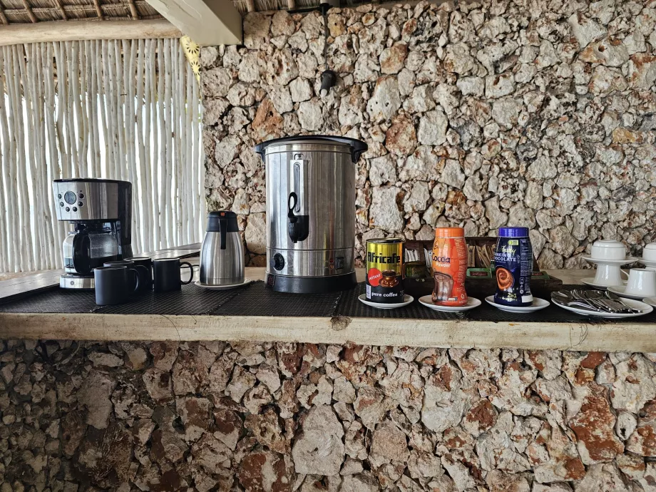 Está disponível café coado não filtrado, bem como chás ensacados.
