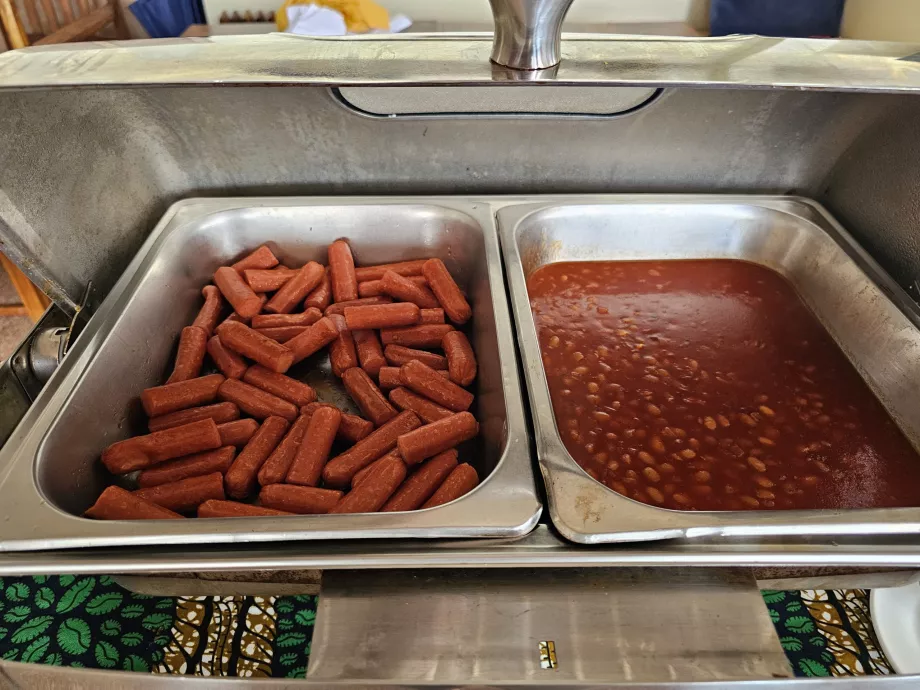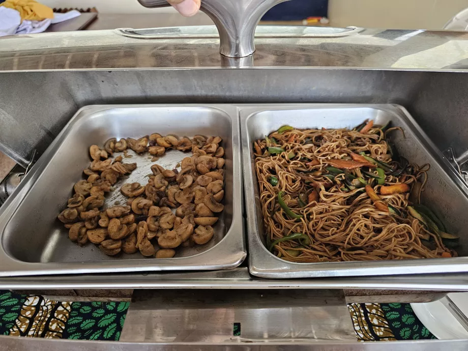 Há três tipos de comida quente à escolha - sobretudo massa ou arroz, salsichas de muito má qualidade, panquecas chapati ou outros produtos de pastelaria locais, legumes cozinhados, feijões ou cogumelos.