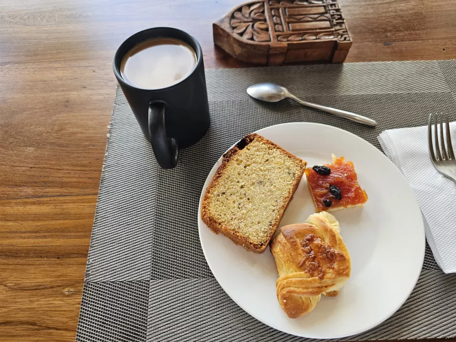 Outras ofertas incluem iogurte, dois a três tipos de fruta, pastelaria doce, pão torrado e sempre dois tipos de sumo + água.