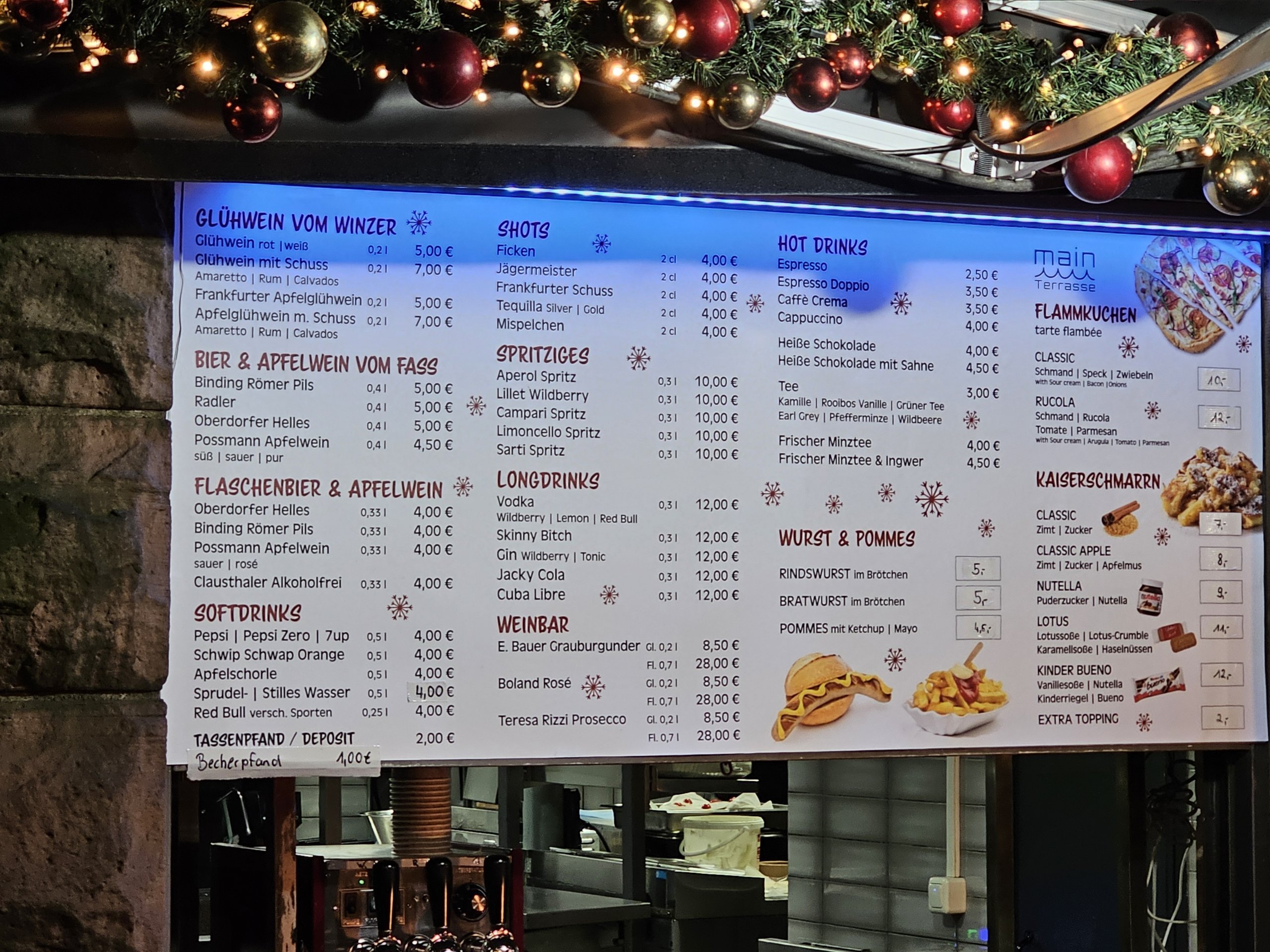 Algumas das bancas maiores também aceitam pagamentos com cartão, mas são muito poucas, pelo que o dinheiro é imprescindível quando se visita o Mercado de Natal de Frankfurt!
