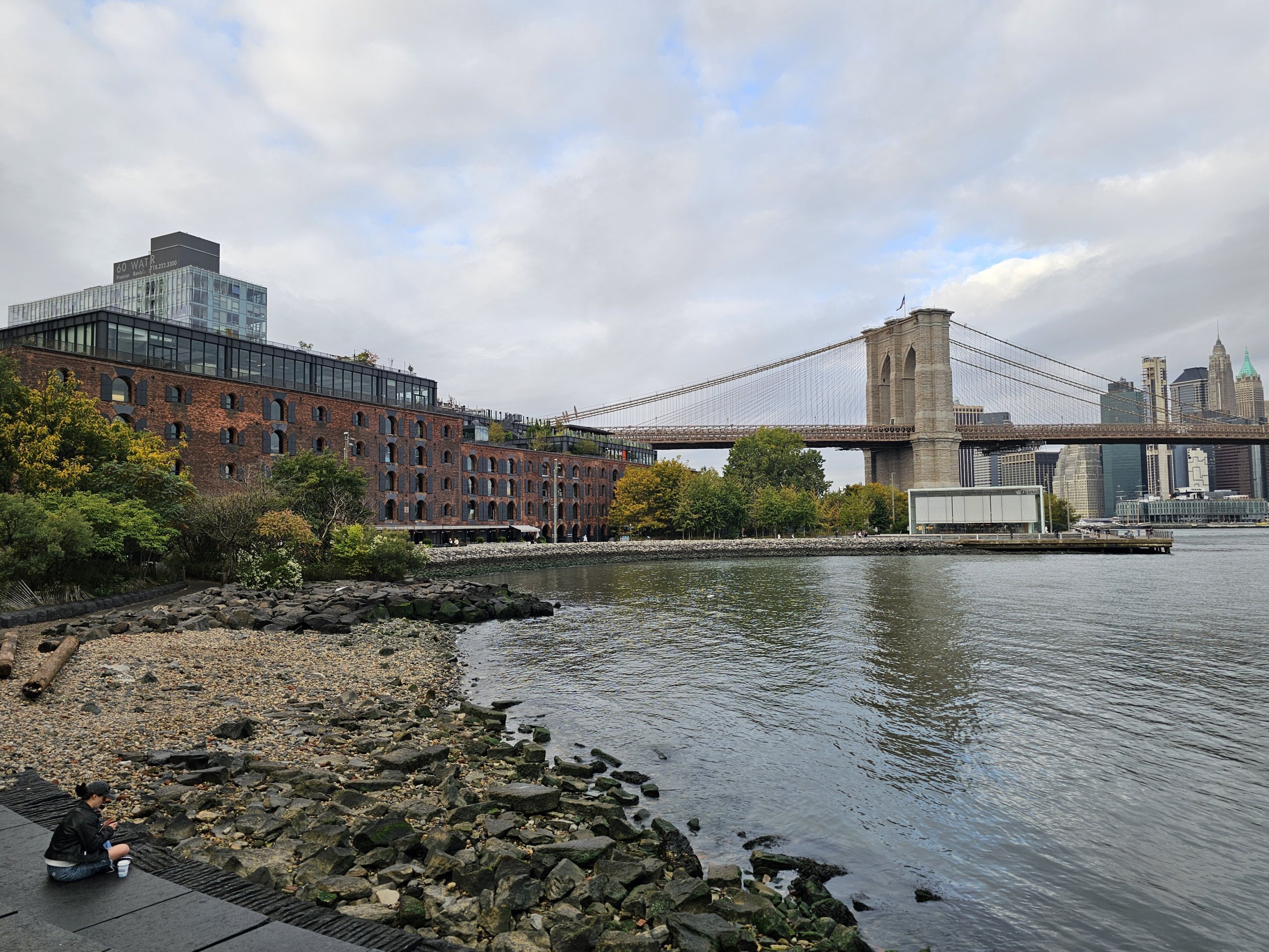 Da margem do rio, é possível ver as pontes de Manhattan e Brooklyn e o horizonte de Manhattan ao fundo.