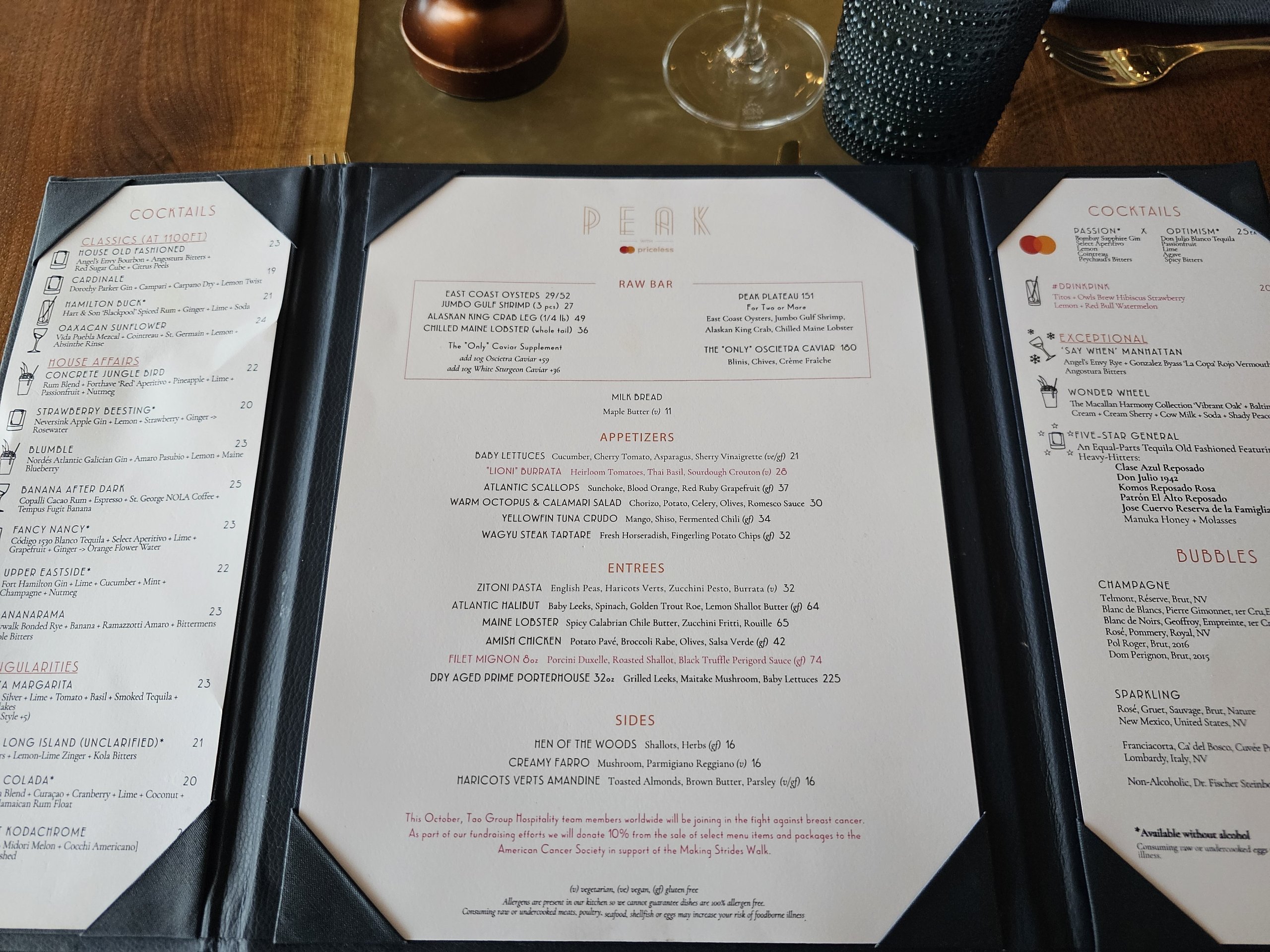 Pode ver o menu completo no sítio Web do restaurante: peaknyc.com/restaurant-bars.