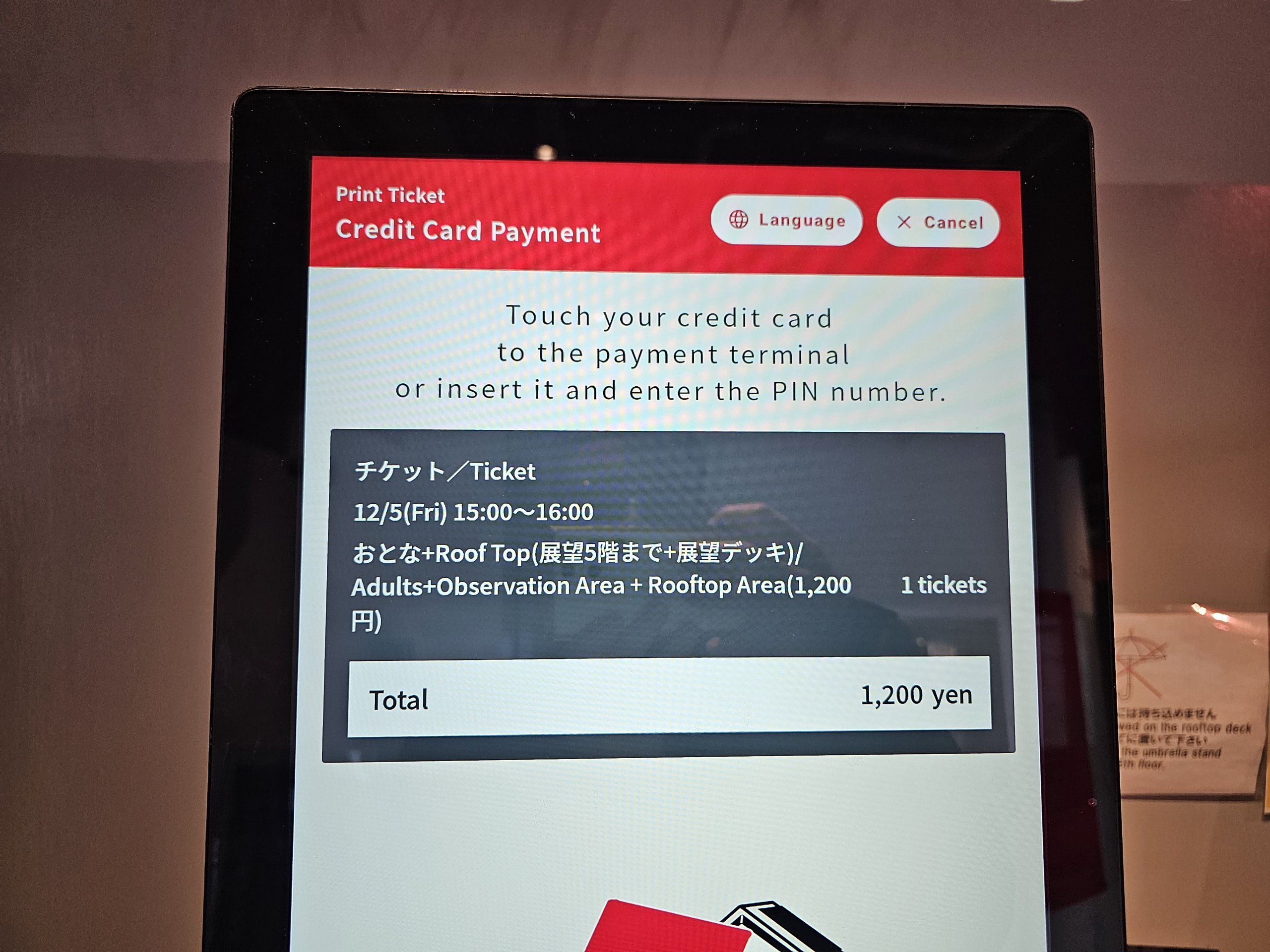 Os bilhetes podem ser adquiridos na máquina de venda automática com um cartão de crédito ou um cartão IC japonês. Não é aceite dinheiro.