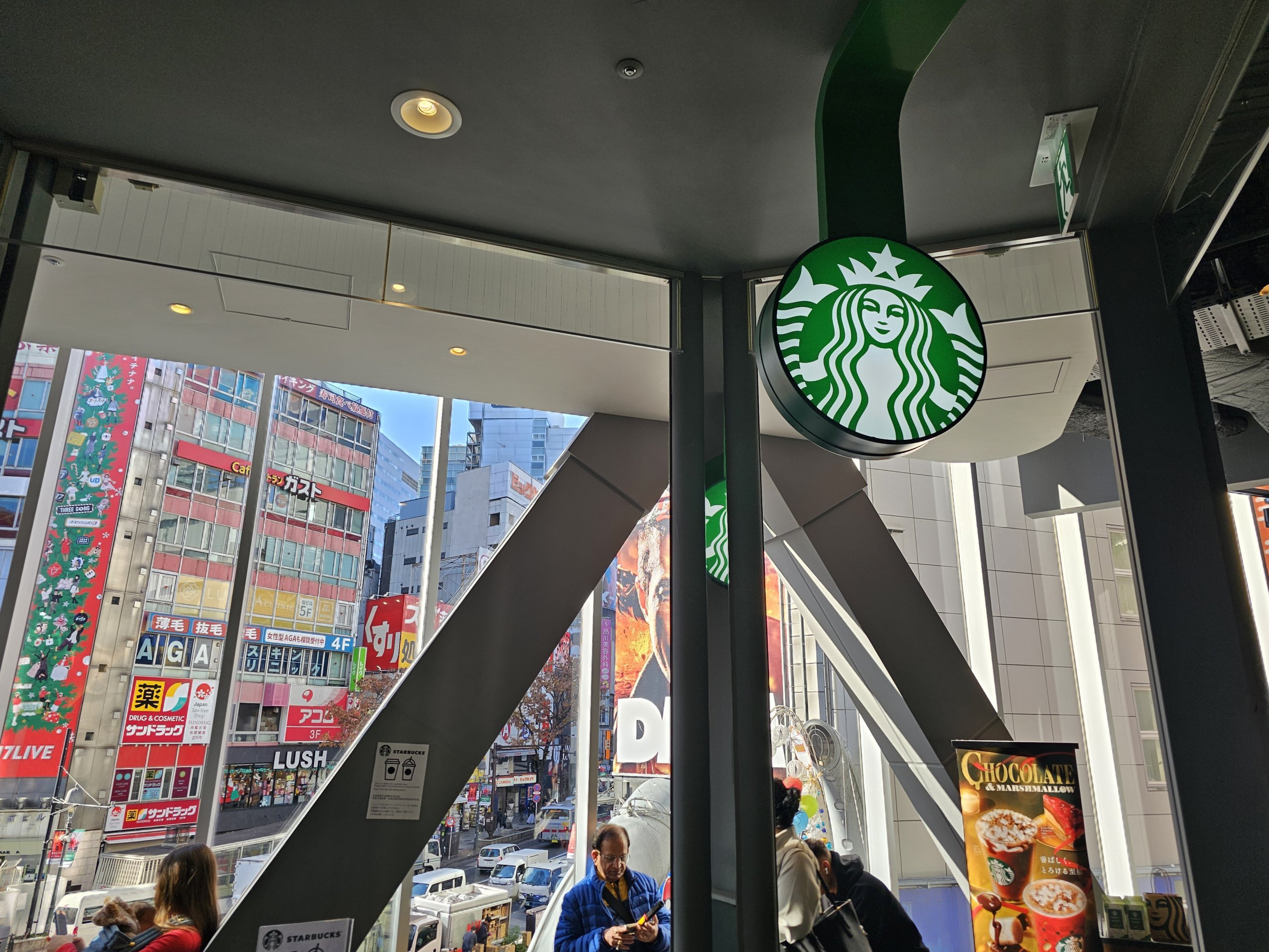 Tem uma bela vista do cruzamento de Shibuya, embora não tão perfeita como a de Share Lounge, uma vez que é ligeiramente obstruída pela estrutura do telhado.