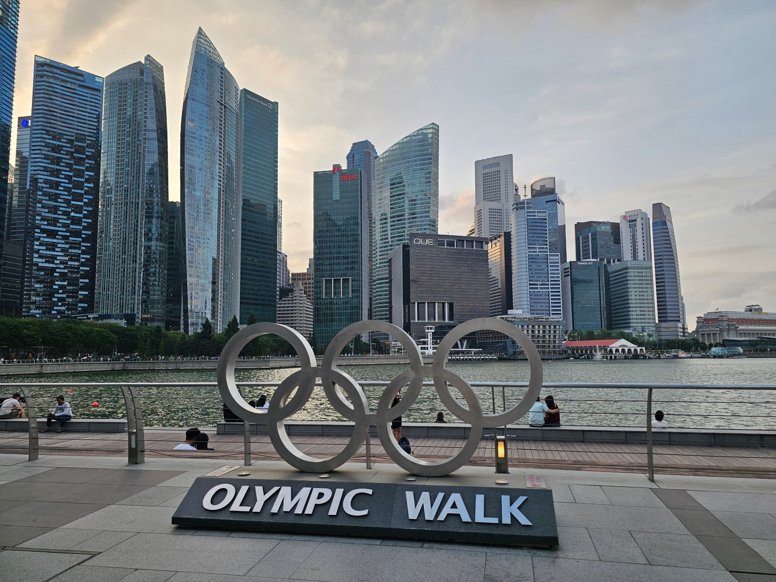 O amplo passeio pedonal com palmeiras, parte do qual se chama Olympic Walk, é um dos meus locais preferidos em Singapura.