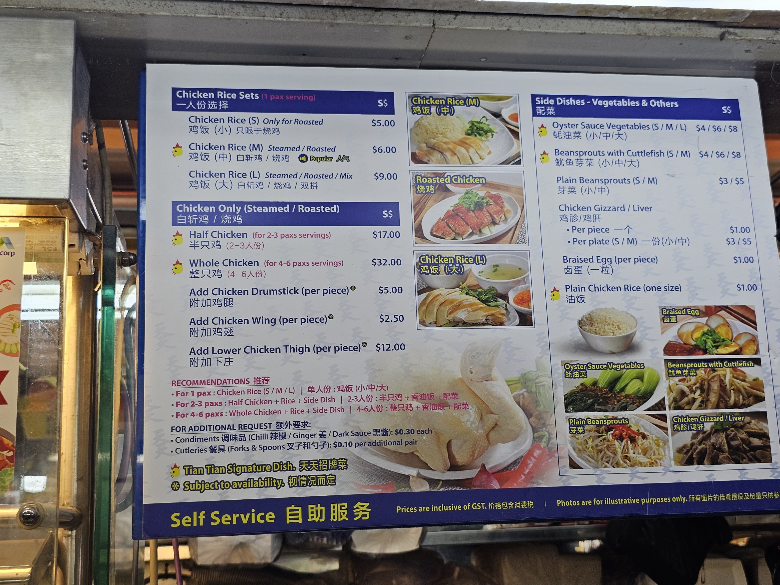 A mais famosa é a Tian Tian Hainanese Chicken Rice, que é uma das bancas mais populares de toda a Singapura. É aqui que se pode provar o famoso arroz de frango Hainanês, um prato frequentemente referido como um dos pratos nacionais de Singapura.