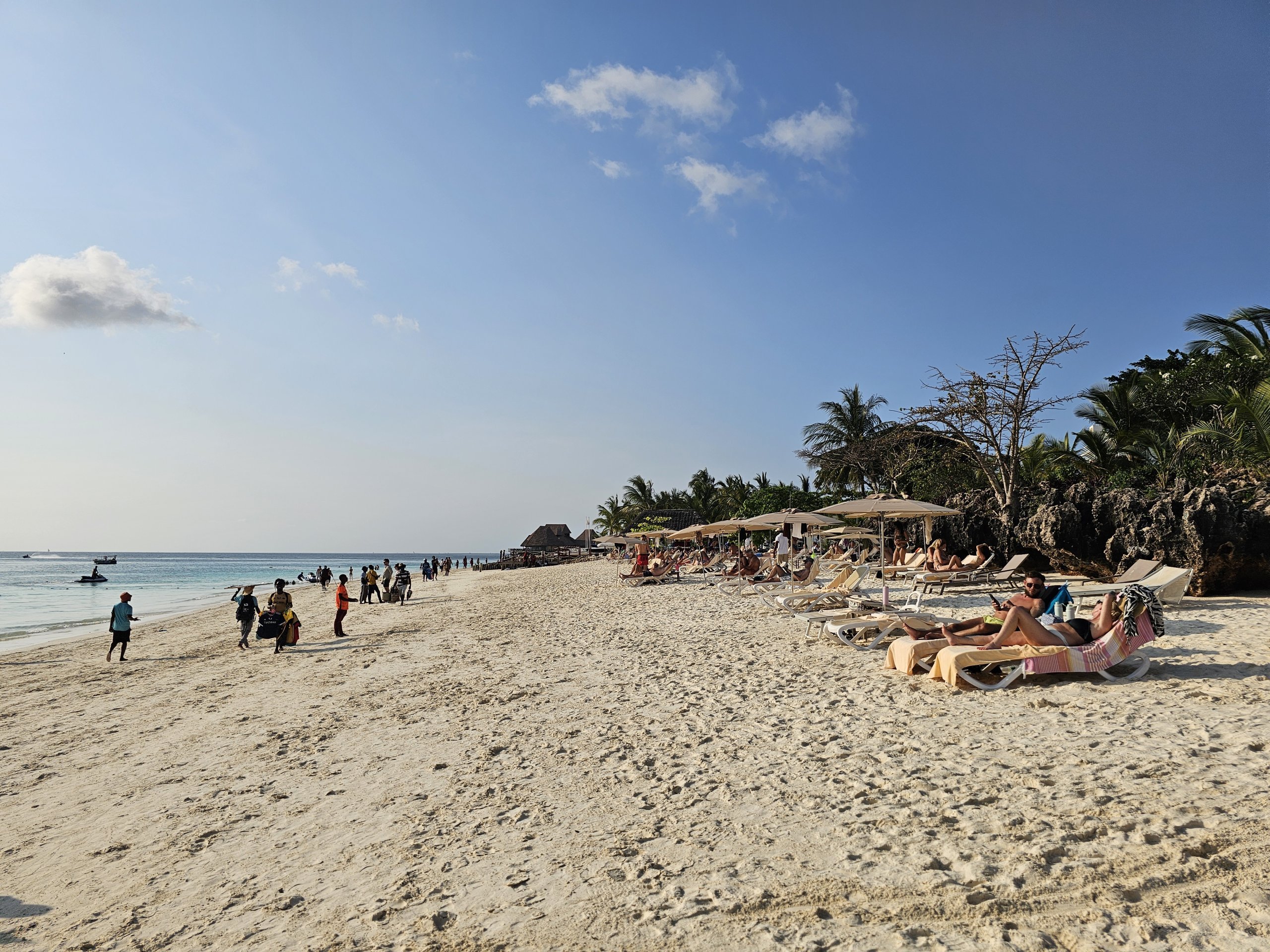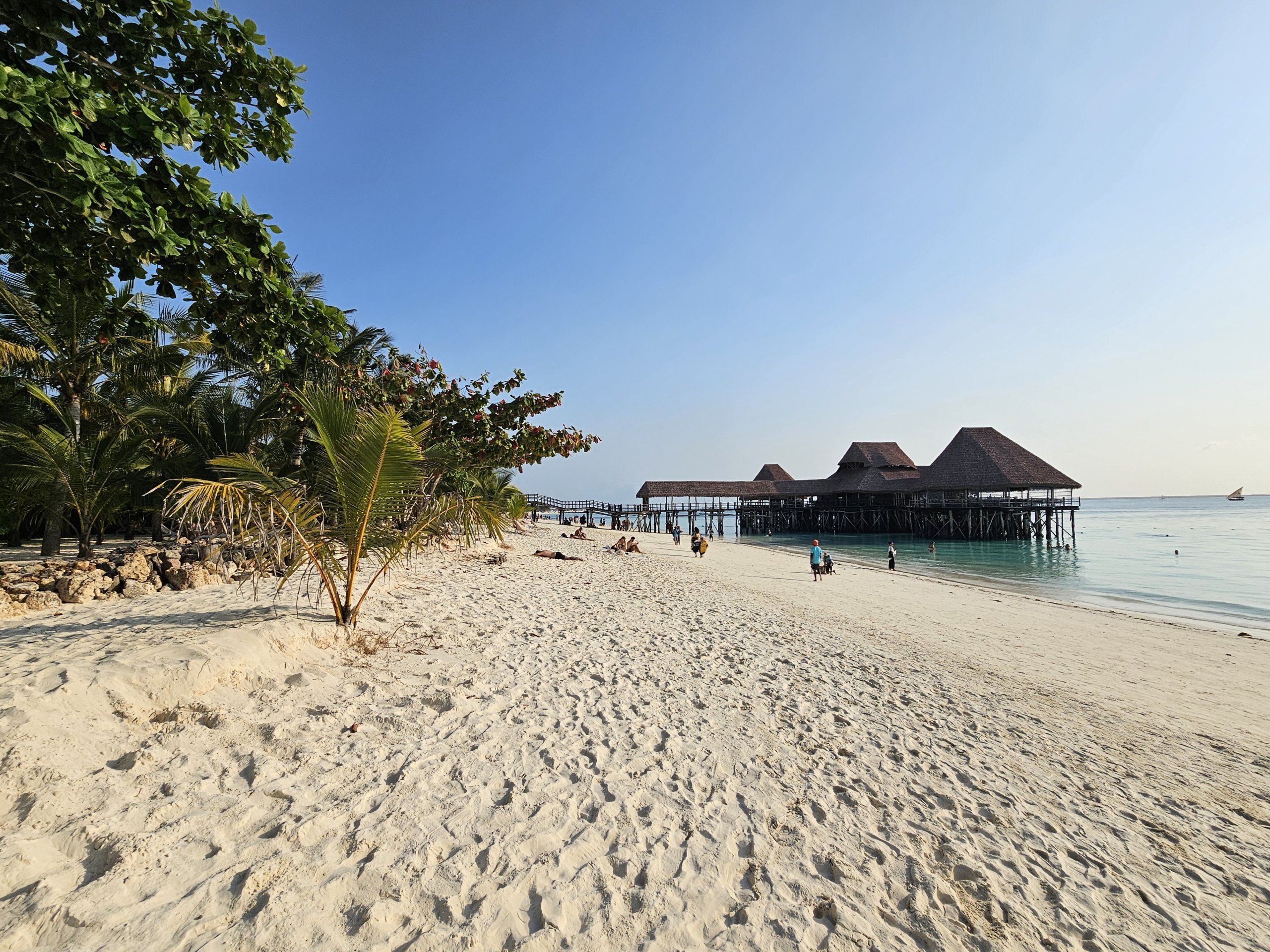 A praia local é sem dúvida a mais bonita que já visitei em Zanzibar e pode nadar no mar mesmo durante a maré baixa, ao contrário das praias da costa leste.