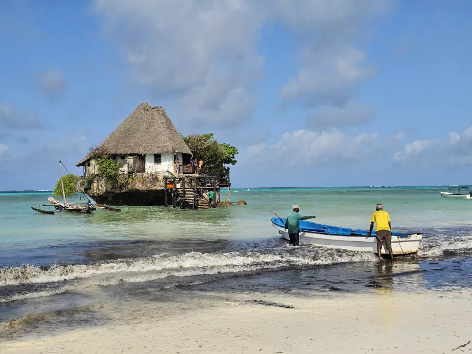 O restaurante The Rock é uma atração icónica não só de Zanzibar, mas de toda a Tanzânia. A pequena casa com aspeto de conto de fadas ergue-se sobre uma rocha no meio do oceano, a cerca de 50 metros da costa e, à primeira vista, dificilmente se saberia que no seu interior se encontra um dos restaurantes mais luxuosos de Zanzibar. [btn "Os 10 melhores hotéis em Zanzibar" https://www.booking.com/region/tz/zanzibar.en.html?aid=2397609;label=p…