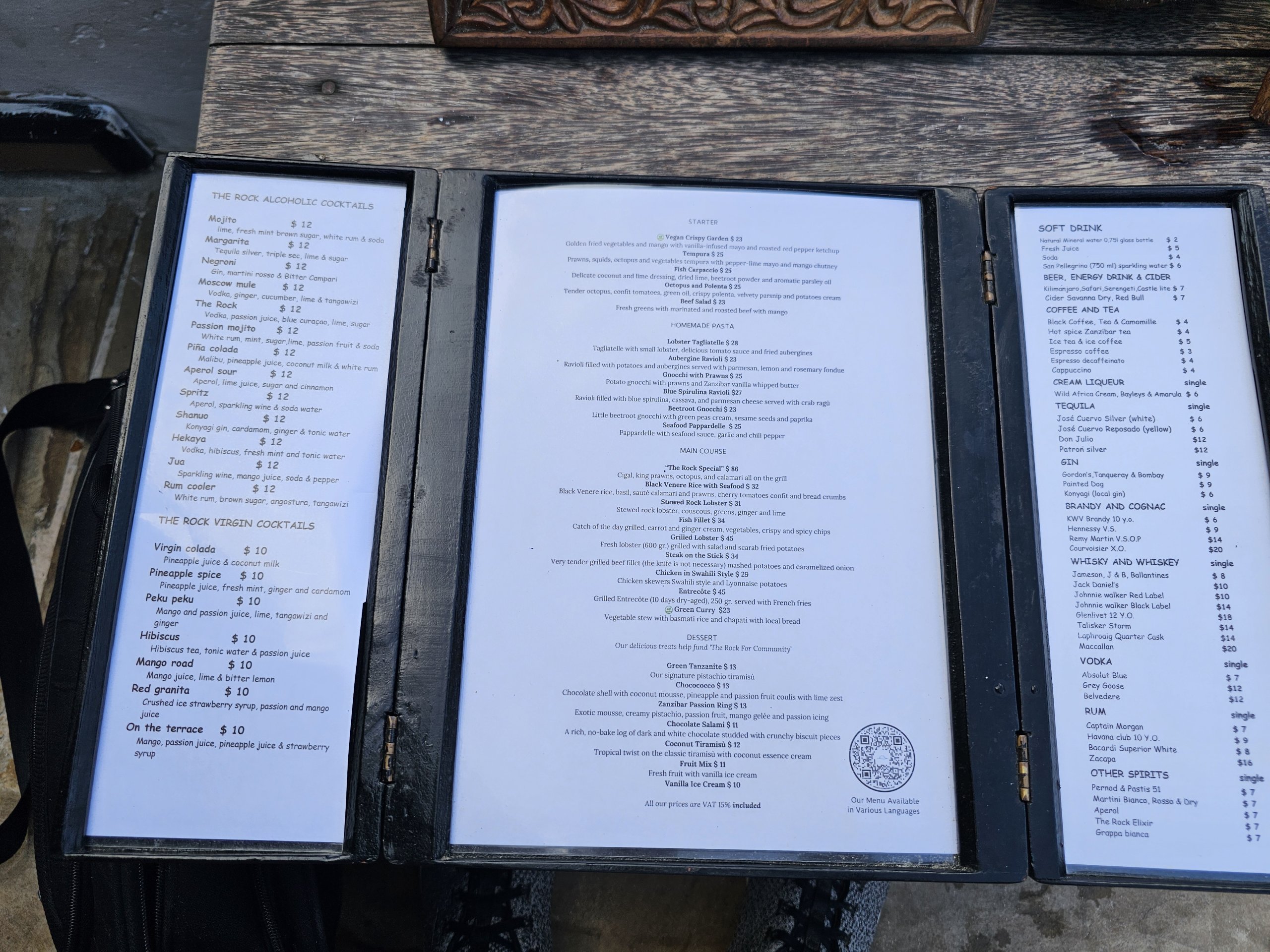 O menu completo pode ser consultado no sítio Web do restaurante: therockrestaurantzanzibar.com.