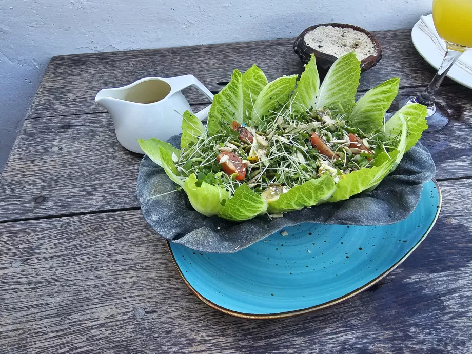 Para entrada, escolhi uma salada de assinatura local com sementes de sésamo e pão. Estava óptima!