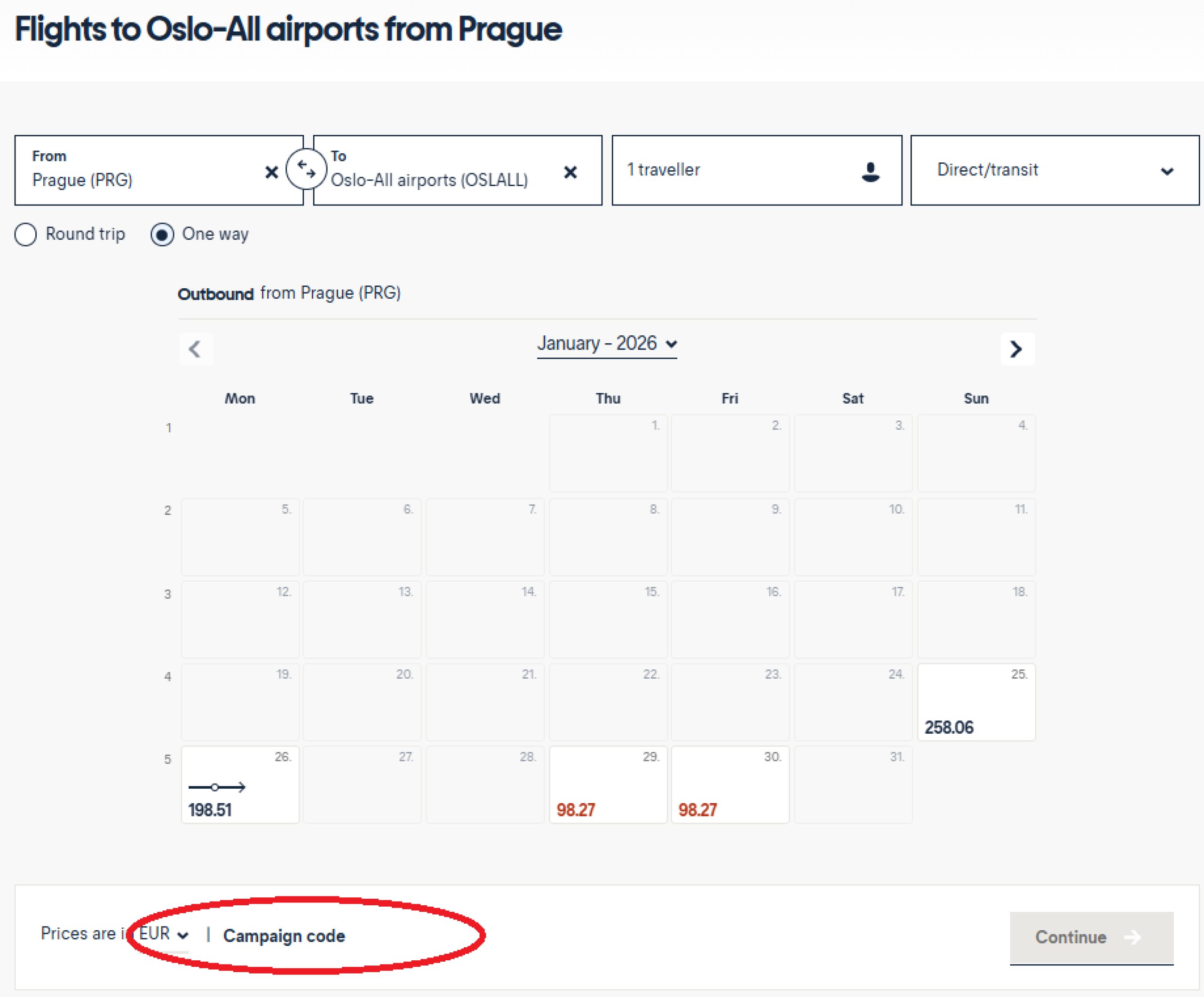 - Dica: Se tiveres entre 12-25 anos, usa o código promocional UNDER26 para voos na Escandinávia. Obterá tarifas especiais só de ida, muitas vezes com 20% de desconto. O código promocional é introduzido na caixa "Código de campanha" quando vê o calendário de voos baratos, ver imagens abaixo.